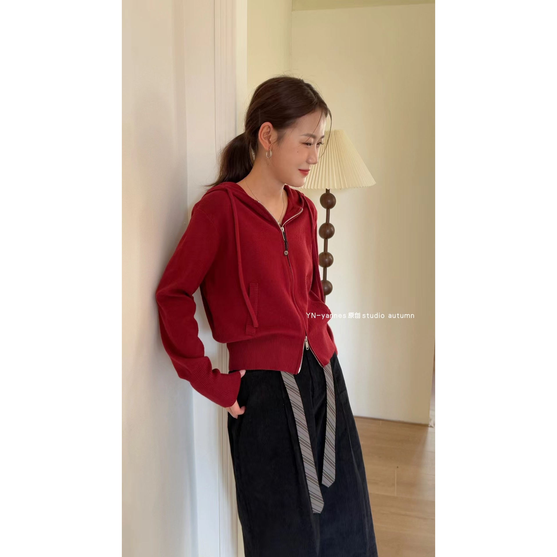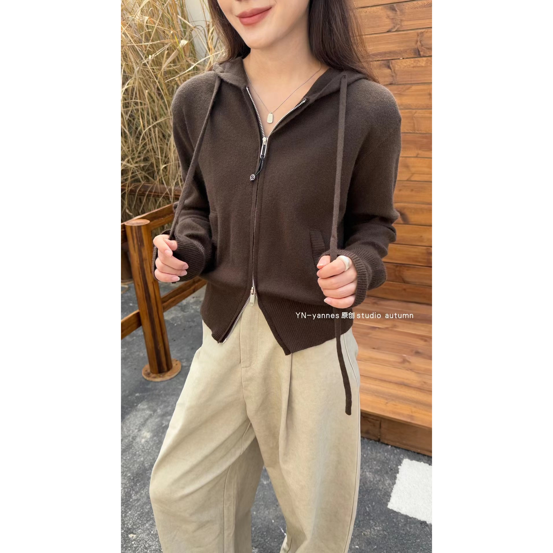 YN双拉链连帽长袖针织开衫外套秋