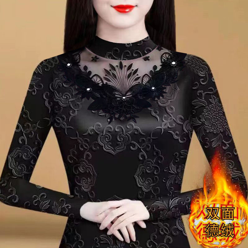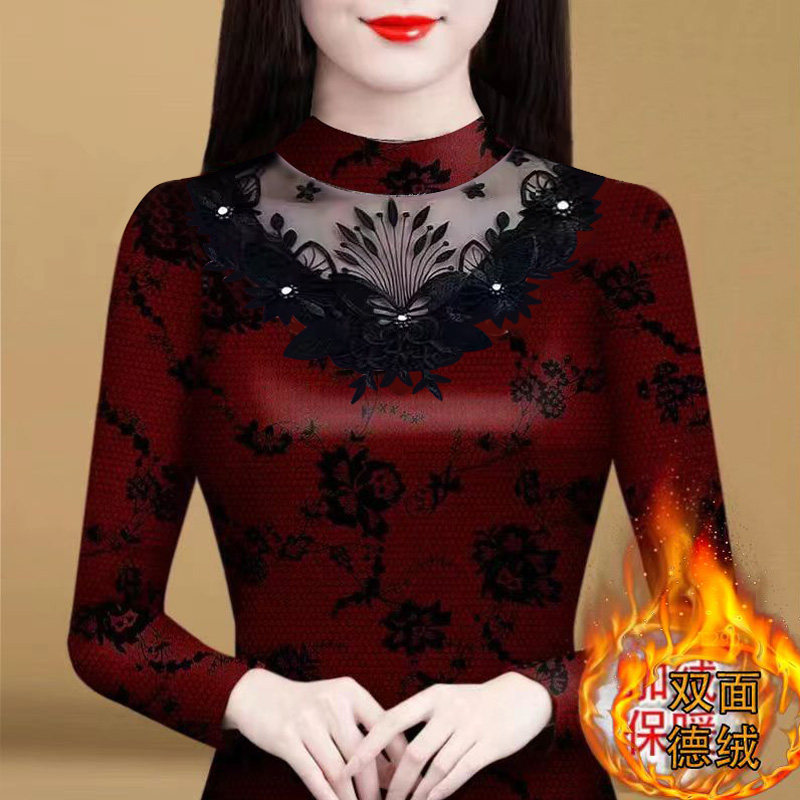 保暖内衣女士加厚加绒冬季上衣蕾丝自发热中老年超舒服打底衫大码