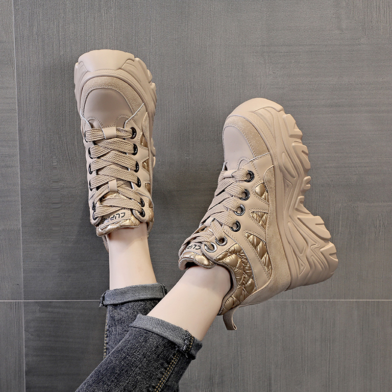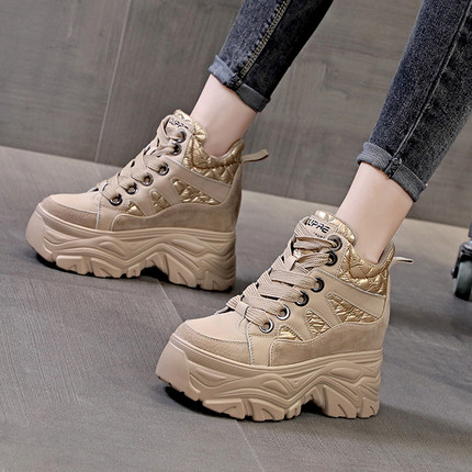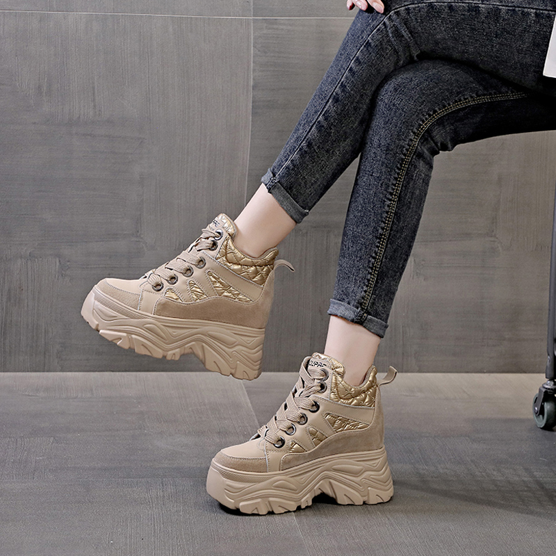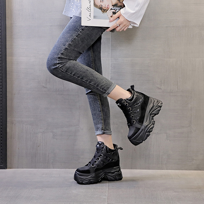 香港真皮高帮鞋小个子内增高女鞋8cm马丁靴厚底休闲松糕坡跟短靴