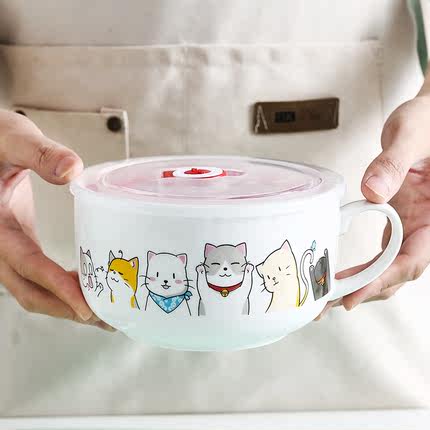 陶瓷泡面碗带盖学生宿舍卡通泡面杯带把手食堂带饭便当碗密封饭盒