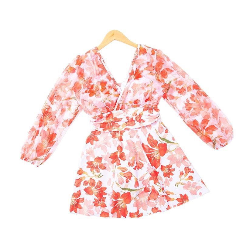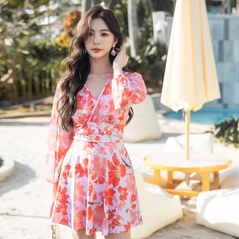 甜美仙女碎花保守遮肉裙款渡假平角连体游泳衣女加肥大码显瘦泳装