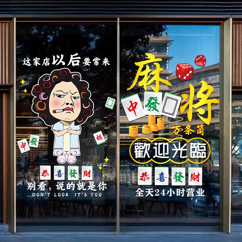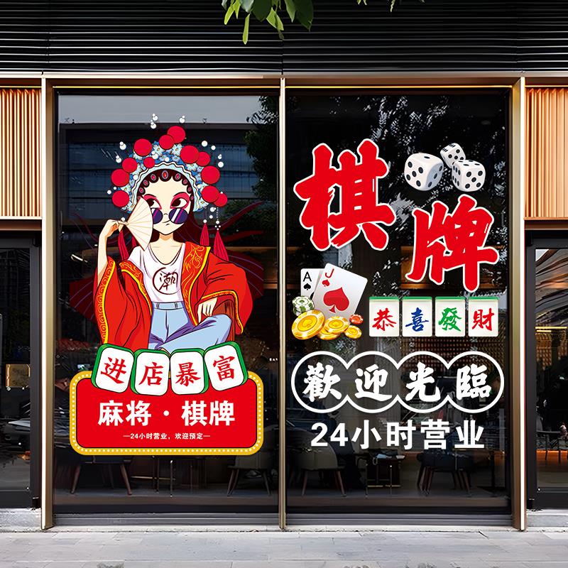 棋牌室自助麻将馆玻璃门贴纸欢迎光临棋艺室装饰广告海报静电贴画