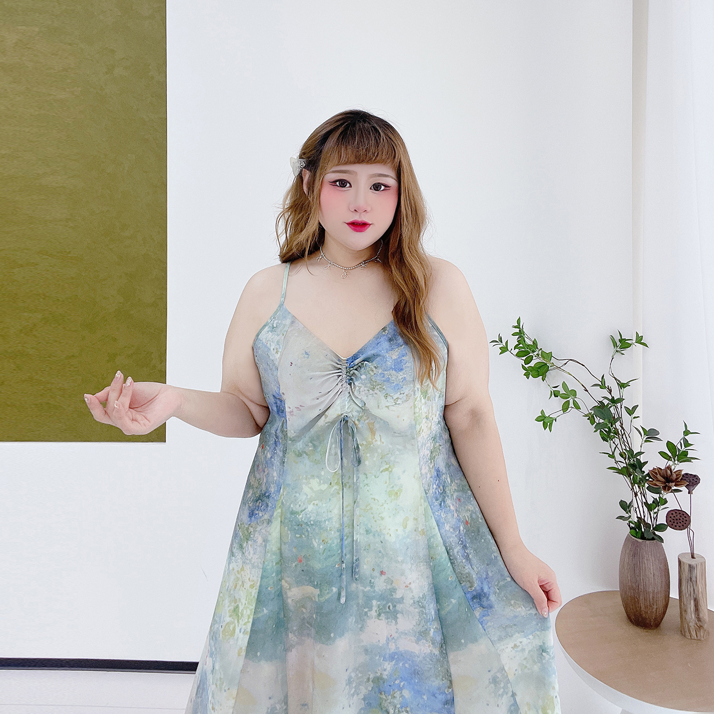 甜美晕染风A字抽绳显瘦胖莹莹大码女装夏小清新时尚V领吊带连衣裙