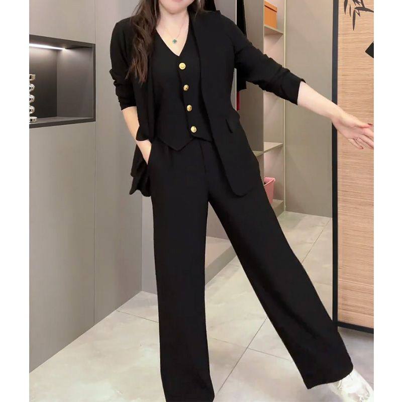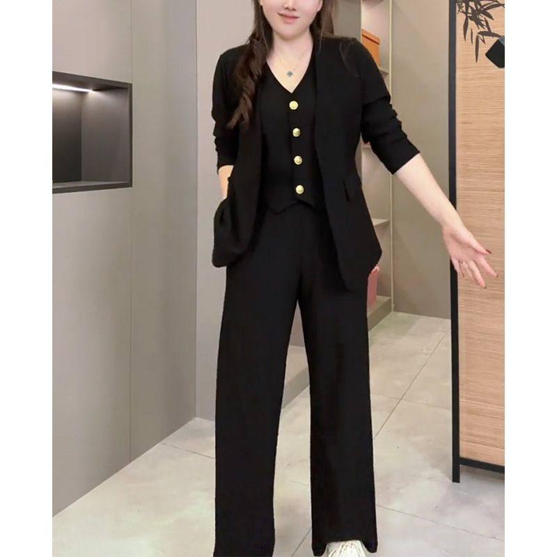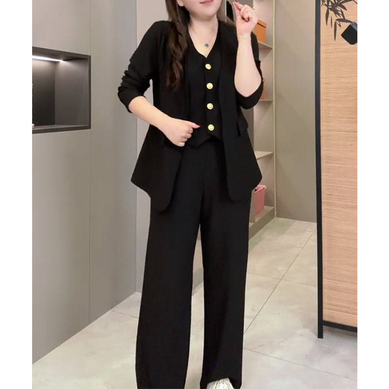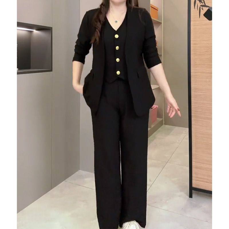 时尚大码显瘦套装女2025秋新款胖mm长袖马甲小西服上衣长裤两件套