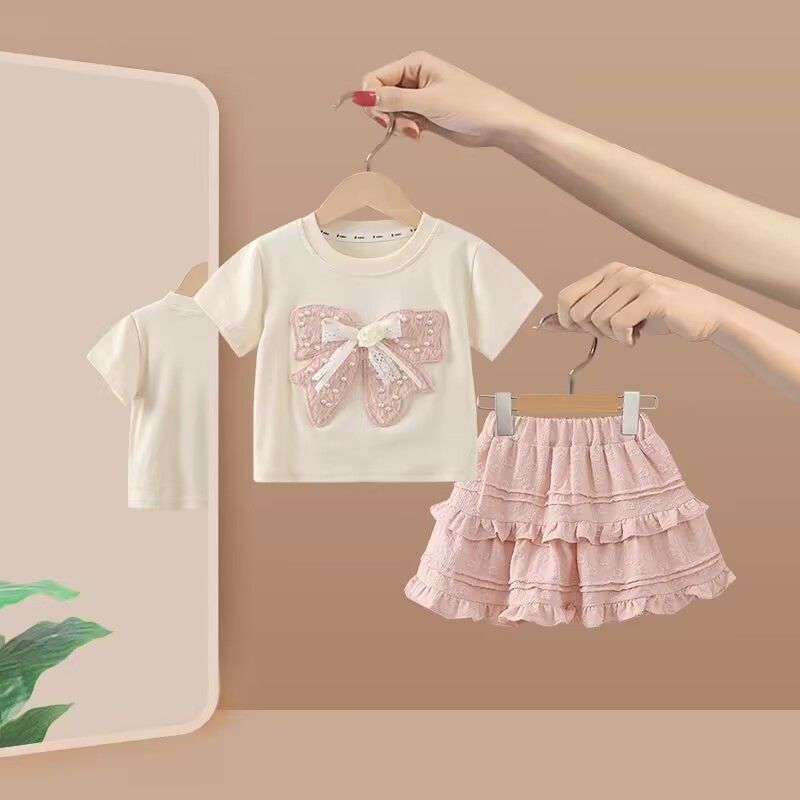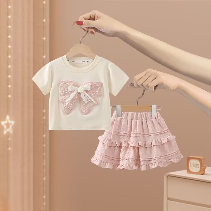 女童套装夏装2025新款儿童女宝宝洋气韩版蝴蝶结短袖短裙两件套裙