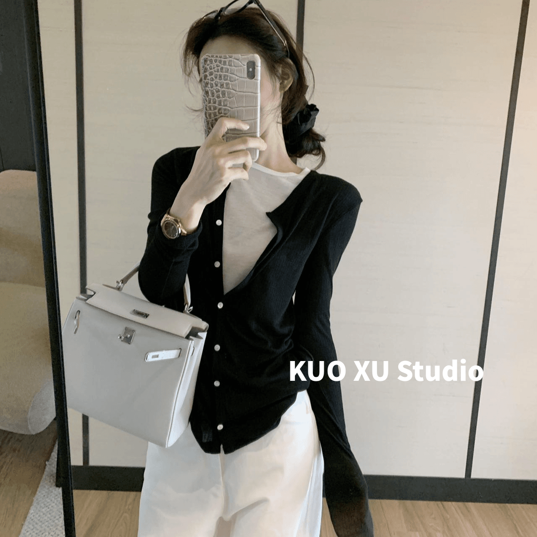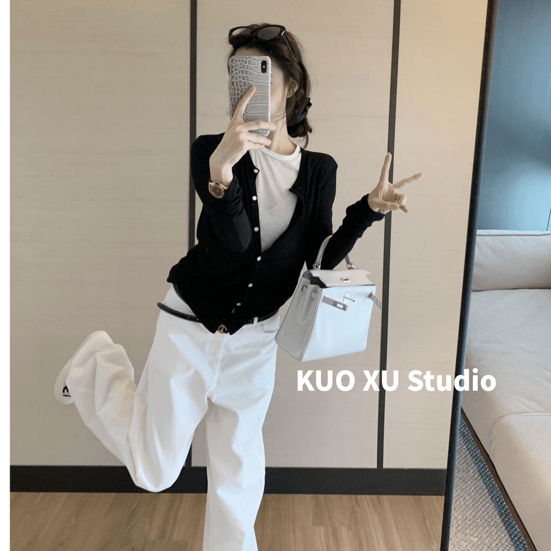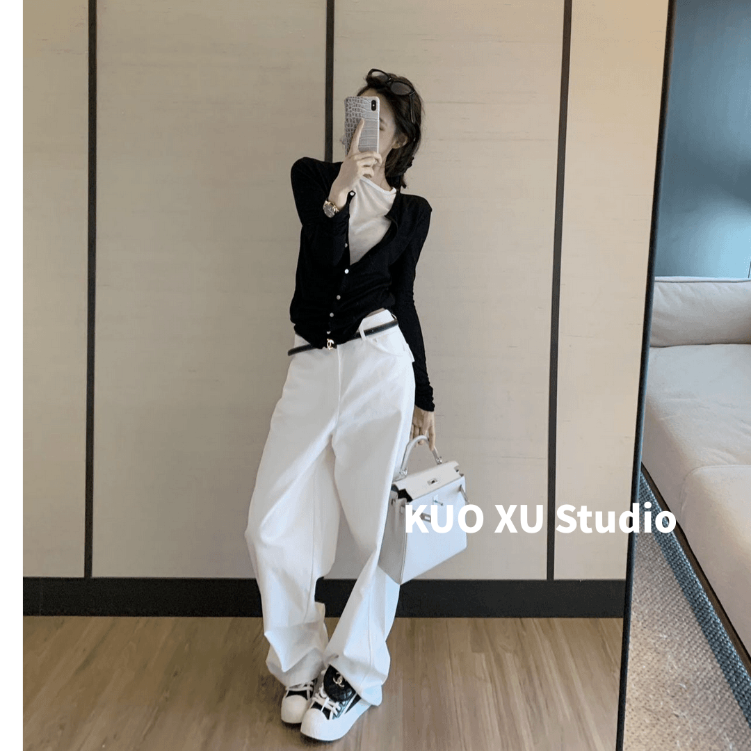一整套早秋穿搭假两件撞色长袖T恤上衣高腰显瘦白色直筒阔腿裤女