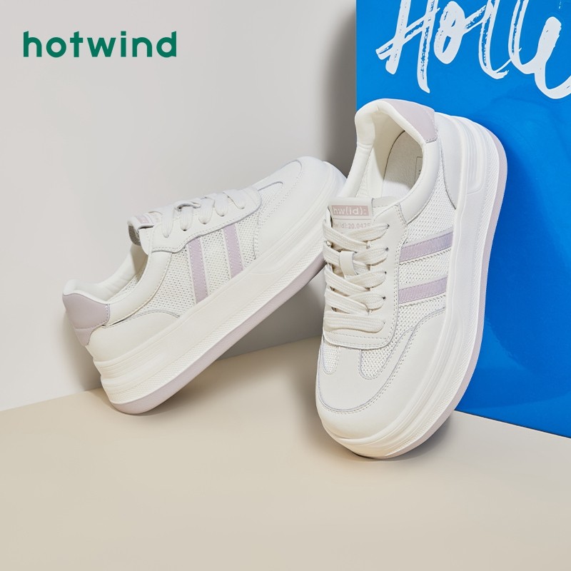 热风秋季新款女士松糕底显高板鞋运动透气小白鞋网面女鞋