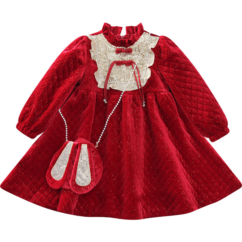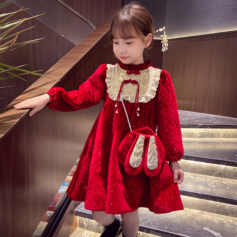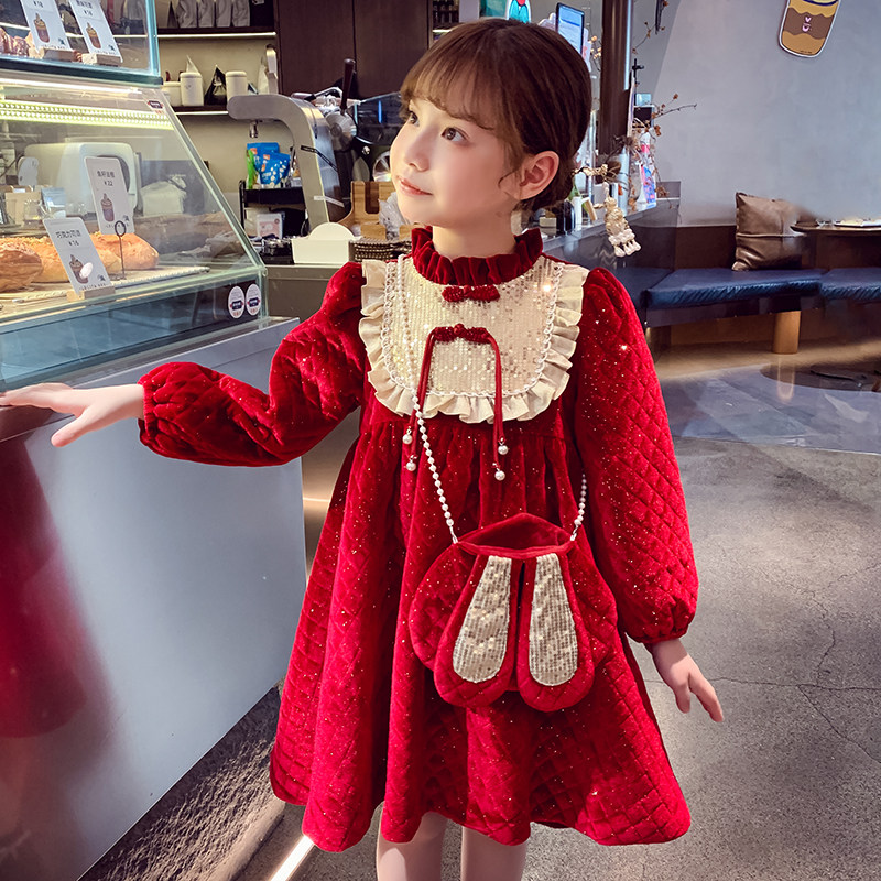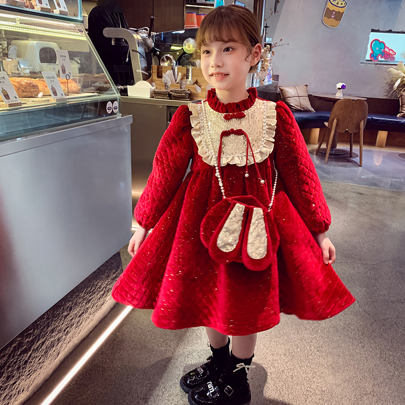 女童加绒连衣裙冬装2025新款洋气儿童红色国风拜年服小女孩公主裙