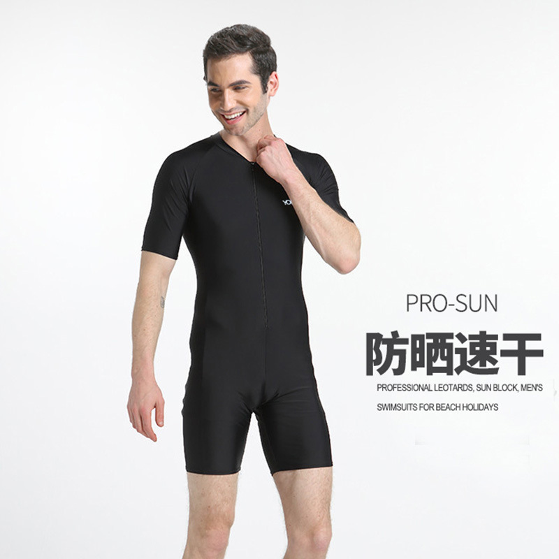 新款情侣泳衣男女保守连体游泳衣男士大码遮肚显瘦平角短袖泳装