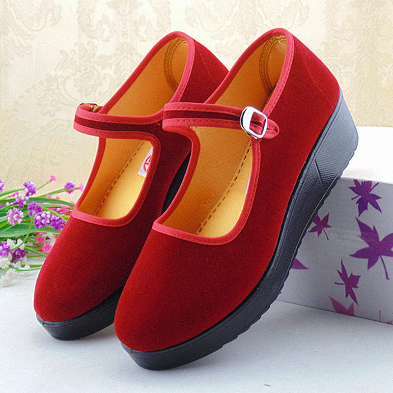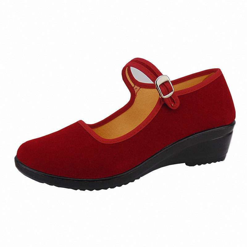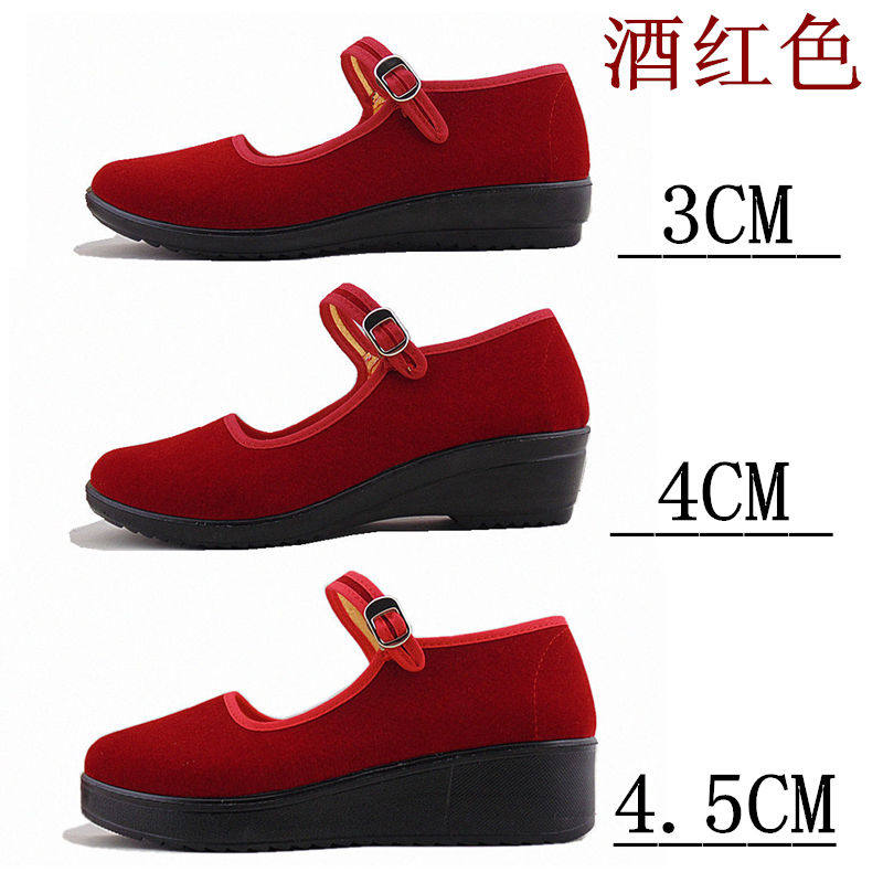 新款老北京布鞋酒红色妈妈舞蹈鞋方口一代女单鞋坡跟聚氨酯软底鞋