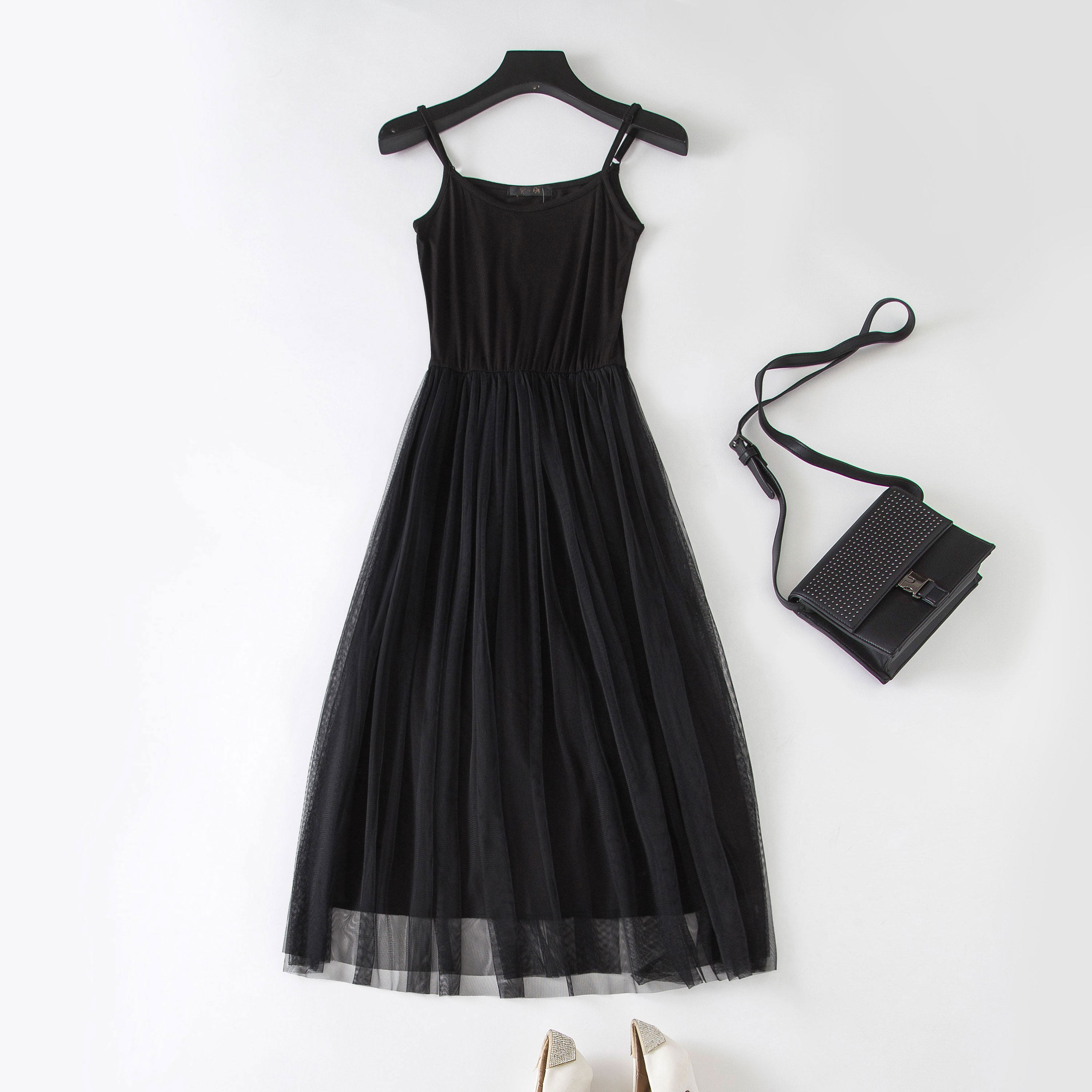 春季莫代尔吊带连衣裙大码黑色长裙宽松内搭蕾丝打底裙网纱背心裙