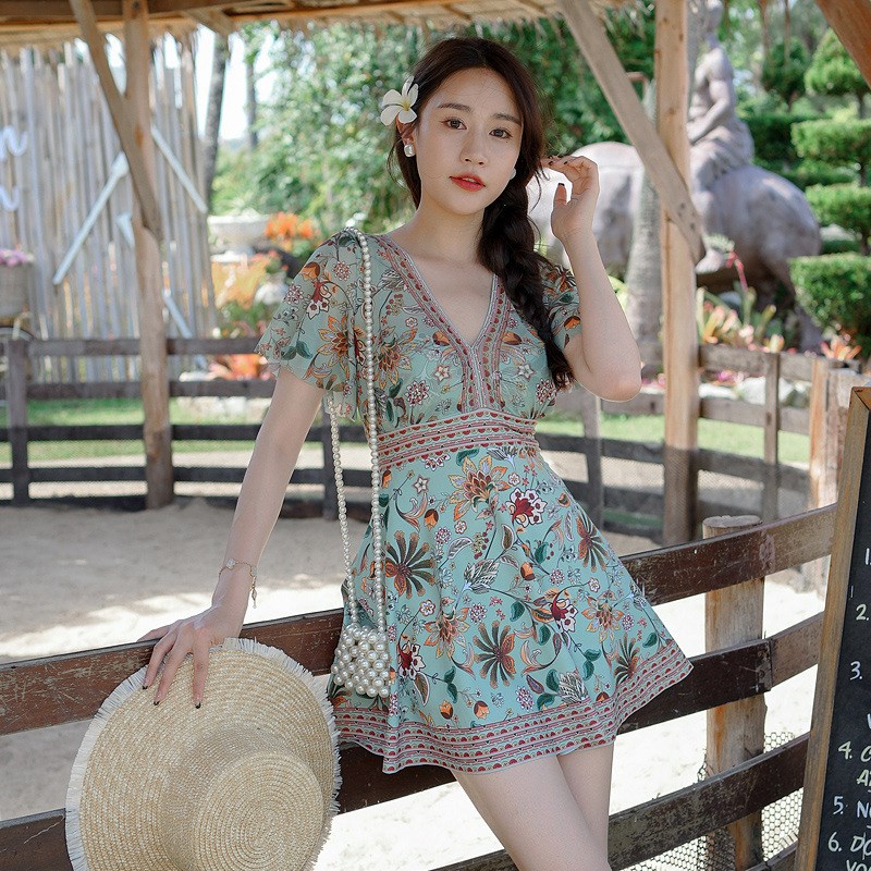 新款大码分体裙式平角显瘦连体泳装小胸聚拢温泉民族风度假女游泳