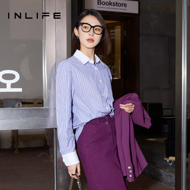 inlife宽松蓝色条纹衬衫纯棉衬衣