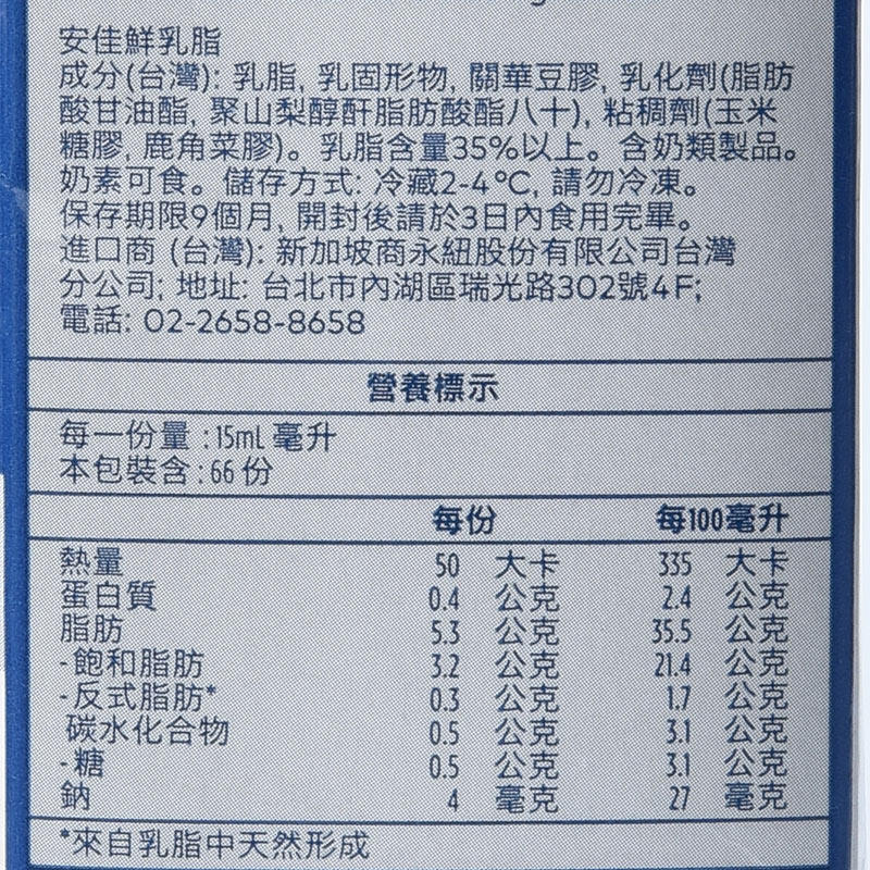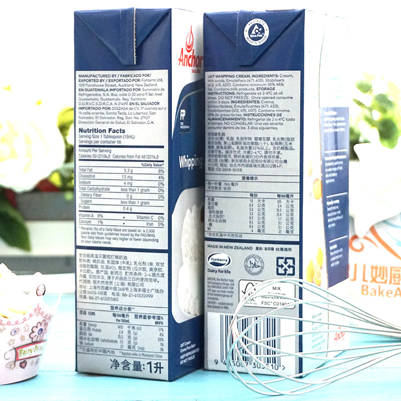 安佳淡奶油1L 新西兰进口动物性稀奶油 西点蛋挞蛋糕裱花烘焙原料