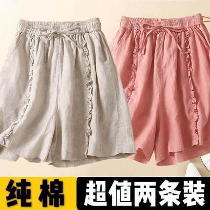 单/两件 纯色木耳边2024夏季显瘦休闲宽松棉麻阔腿大码短裤女洋气