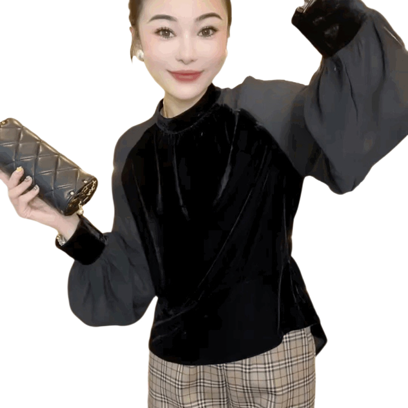 丝绒拼雪纺假两件T恤衬衫女时尚金丝绒黑色圆领上衣洋气打底衫潮