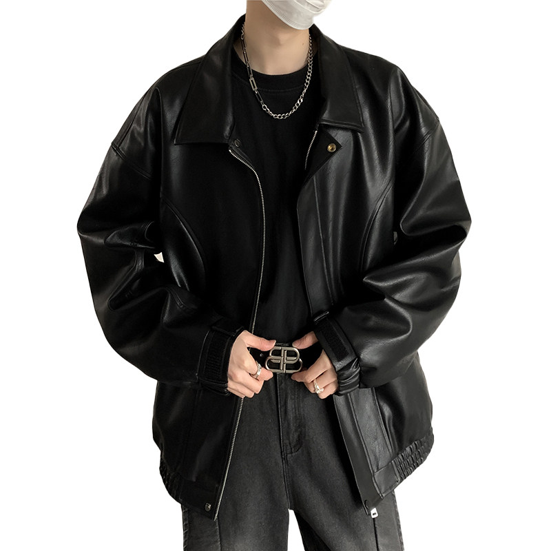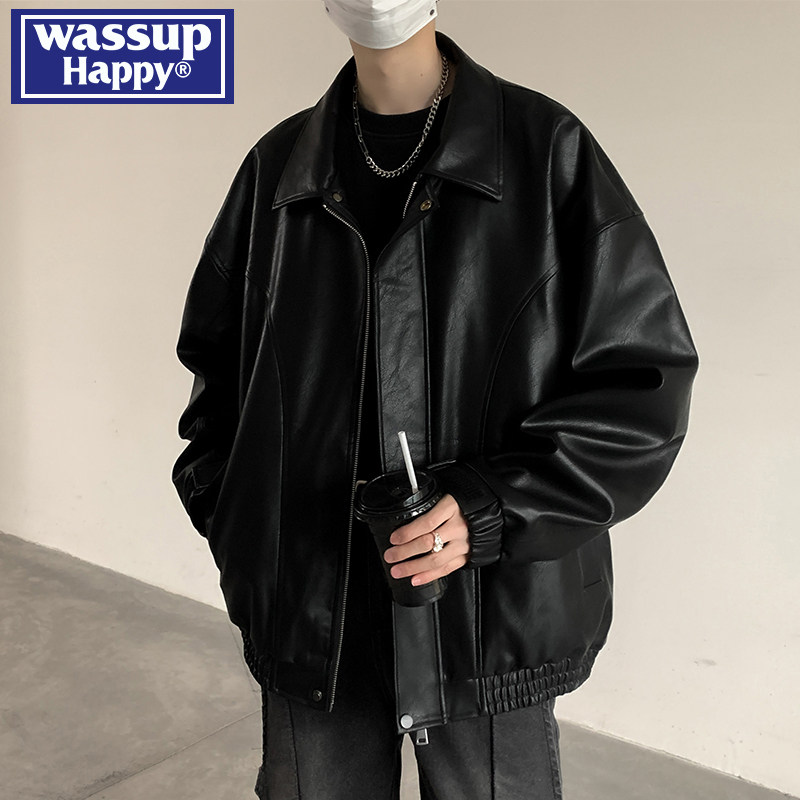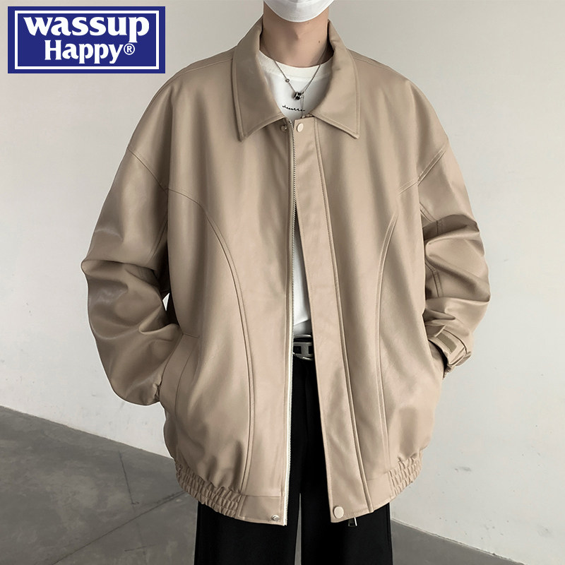 wassup happy美式机车皮衣外套男2025春秋季潮牌宽松翻领休闲夹克