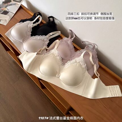 1107#法式贵妇性感蕾丝V领绸缎无痕无钢圈聚拢提拉承托内衣文胸女
