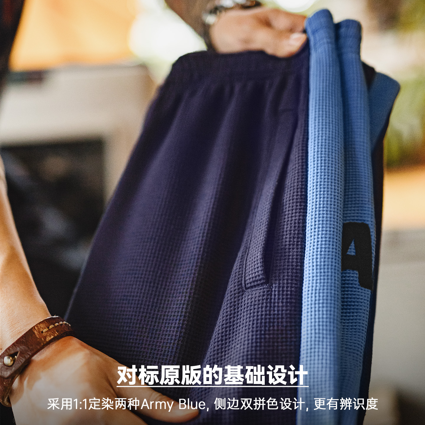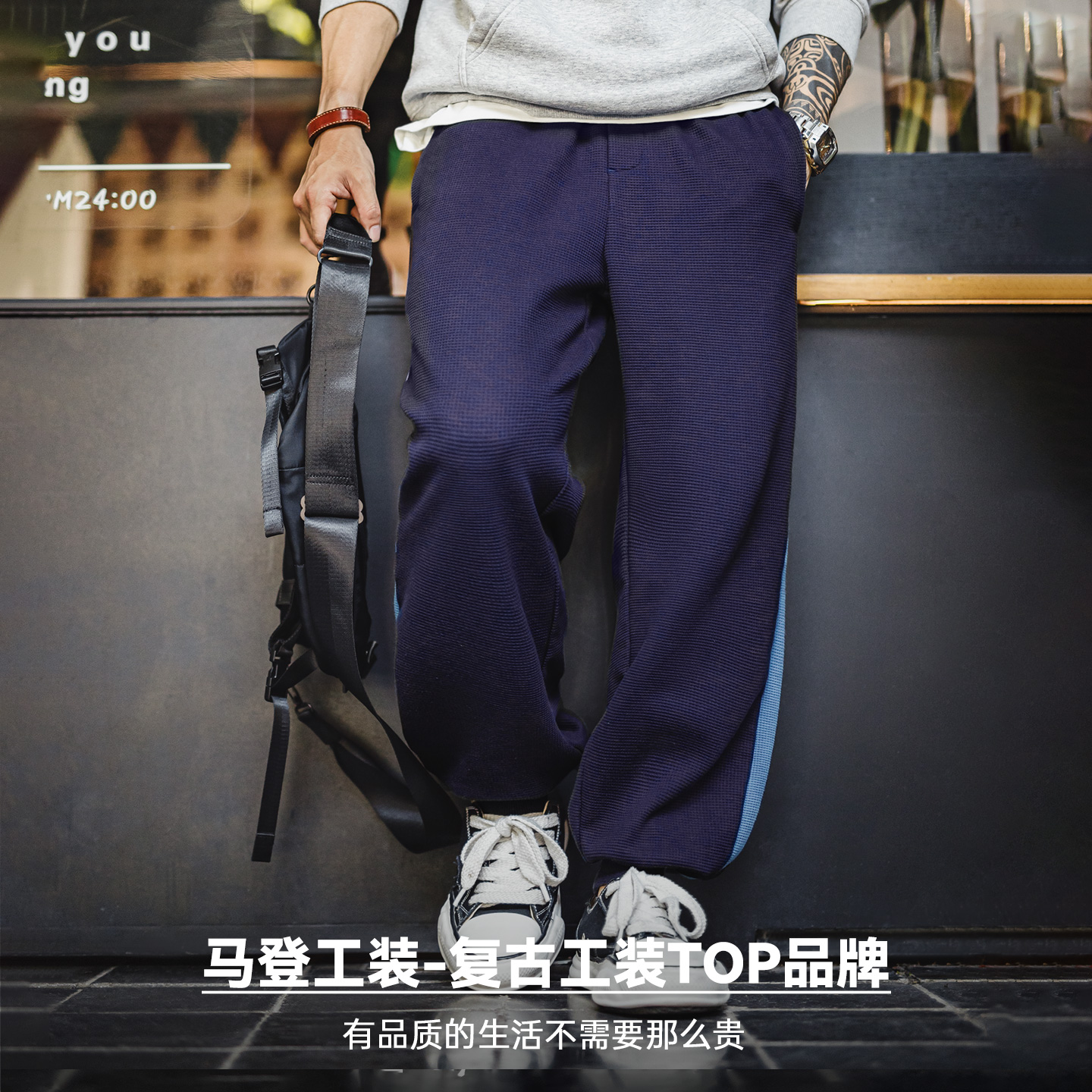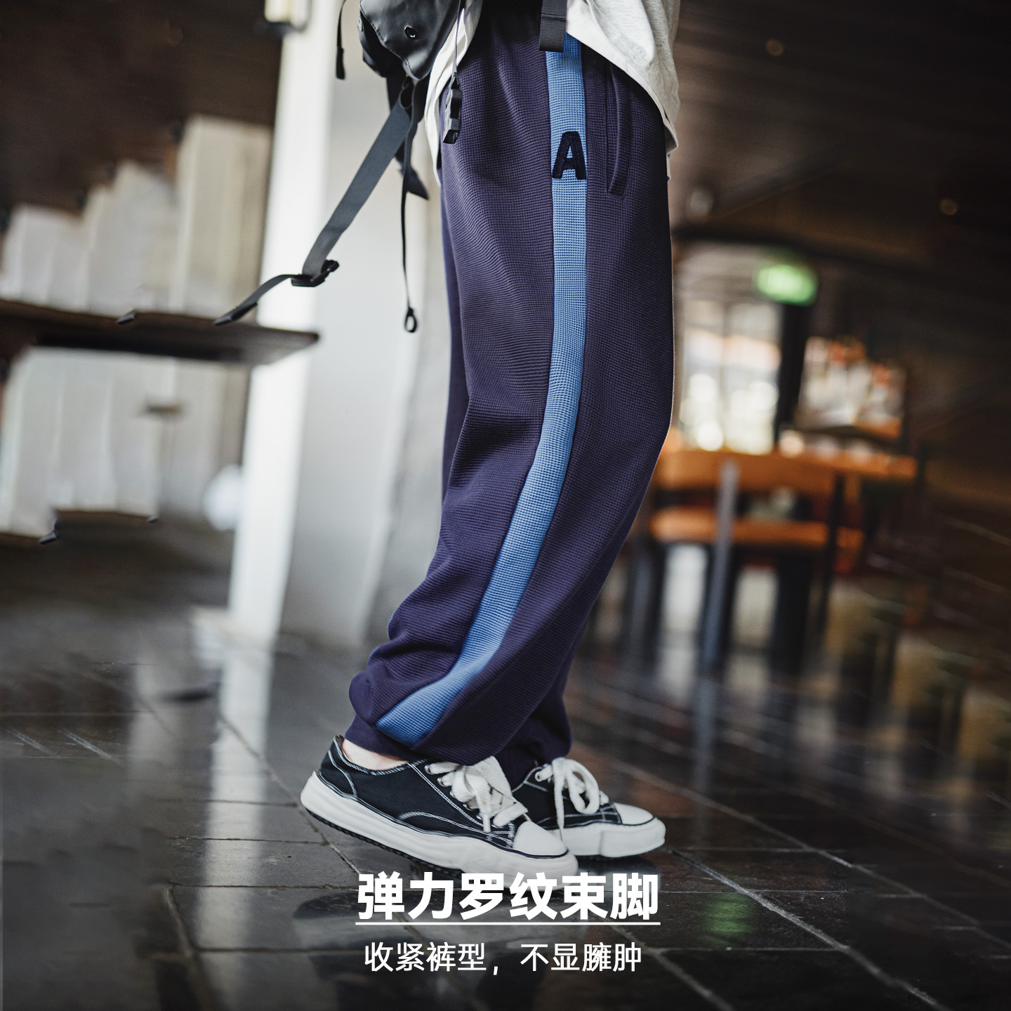 马登工装美式休闲训练卫裤运动华夫格束脚裤松紧腰蓝色长裤子男秋
