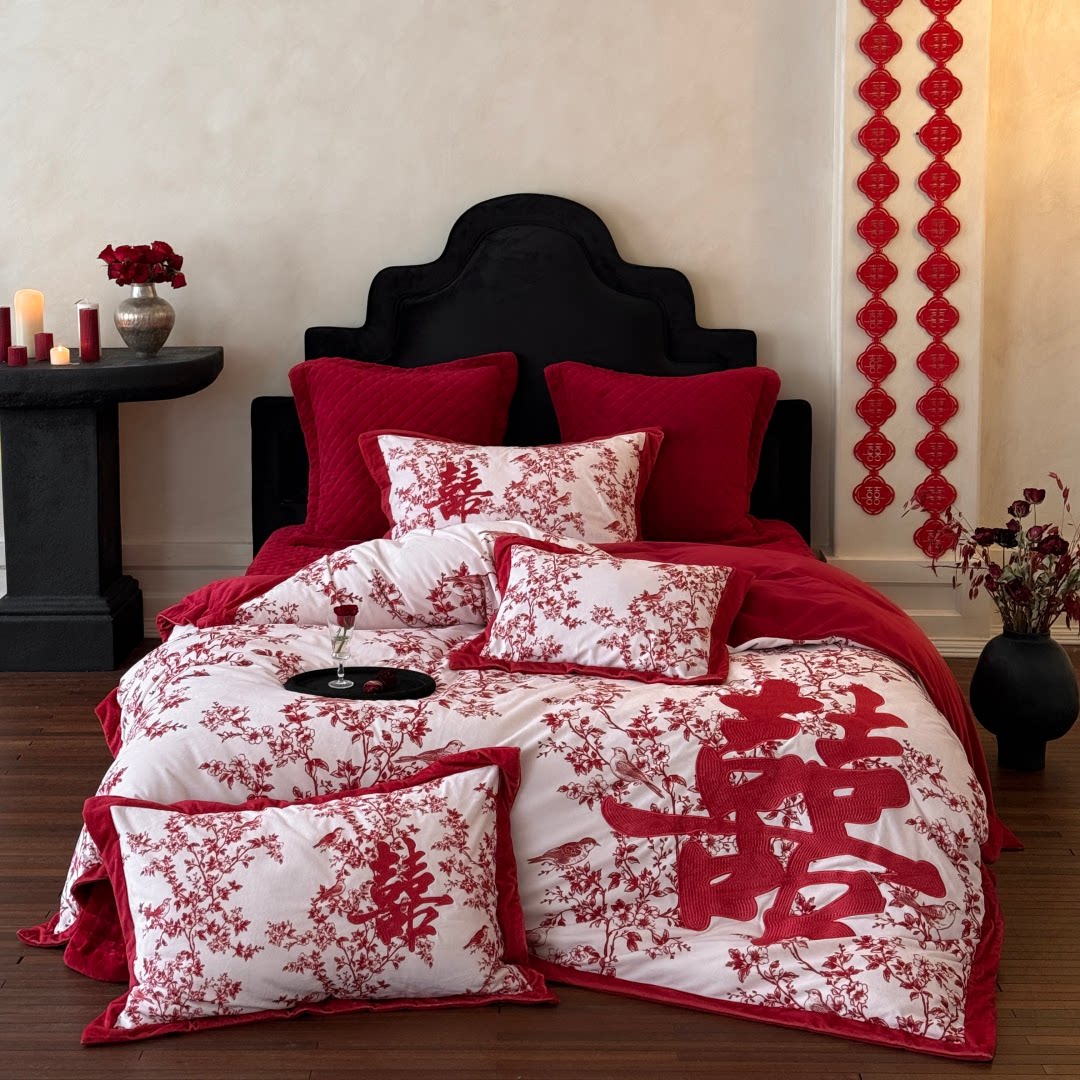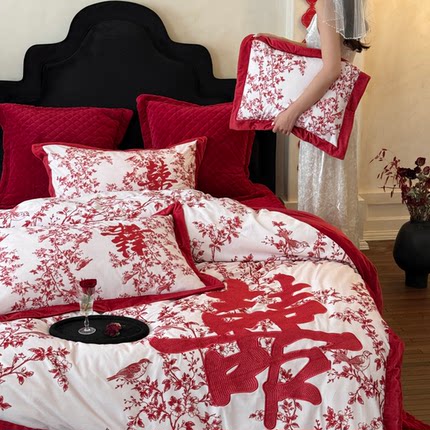 婚庆冬季加厚高克重牛奶绒四件套喜字刺绣珊瑚绒结婚被套床笠床品