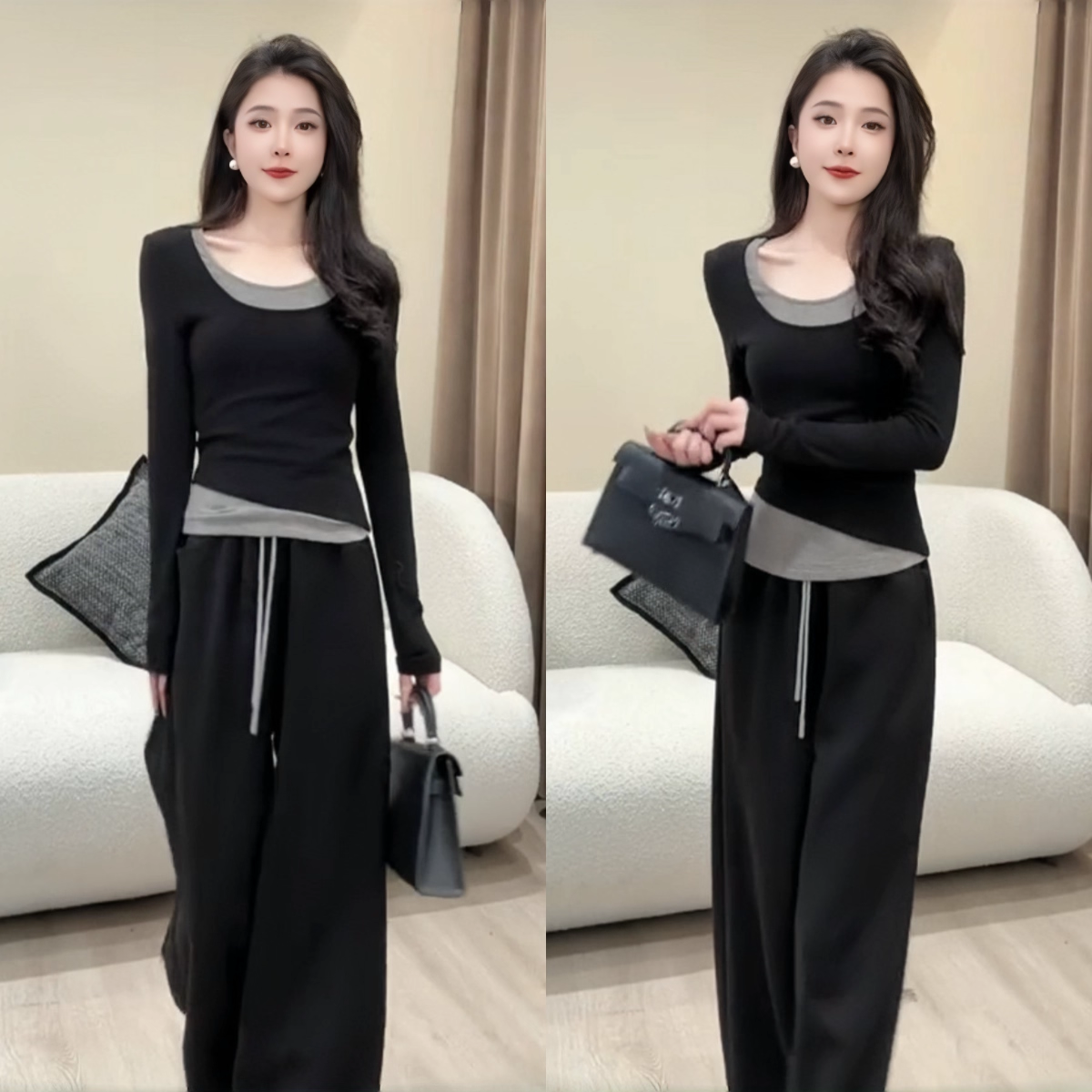 欧货时尚洋气运动休闲套装女秋季2025爆款假两件T恤阔腿裤两件套