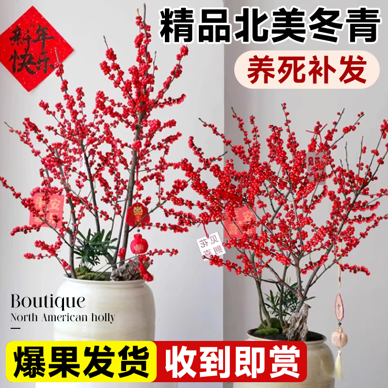 北美冬青盆栽带红果春节老桩盆景耐寒庭院植物年宵花卉可鲜切花枝