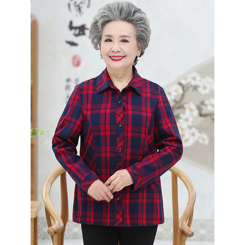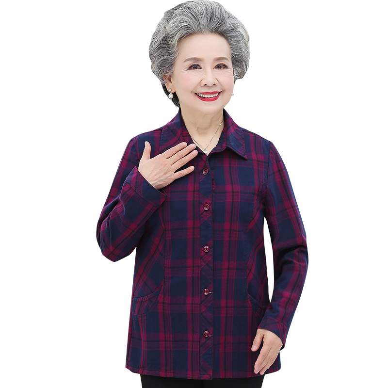 奶奶秋装老人长袖衬衫女纯棉中老年人衬衣妈妈全棉格子外套老太太