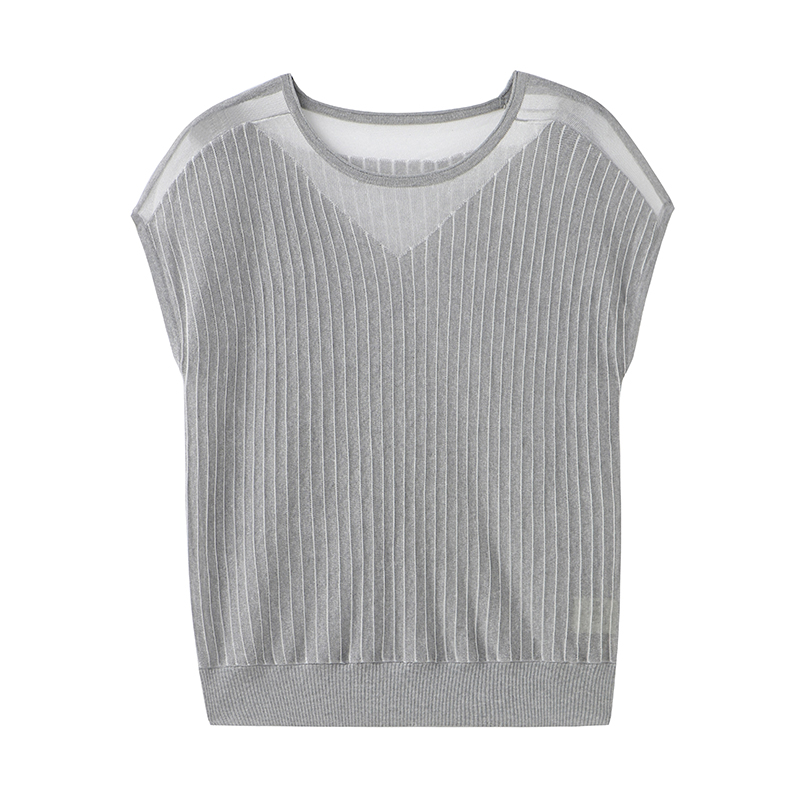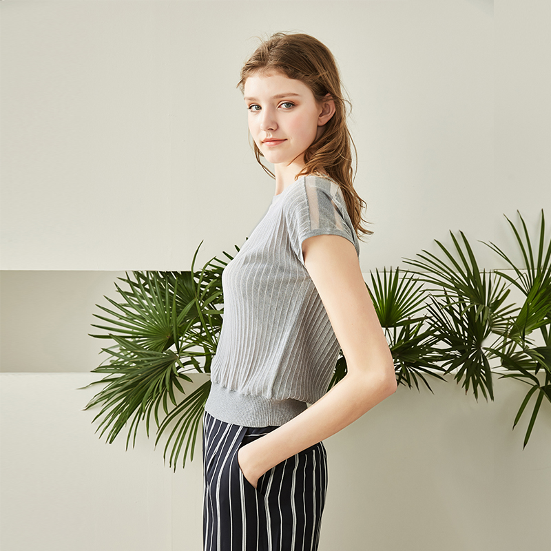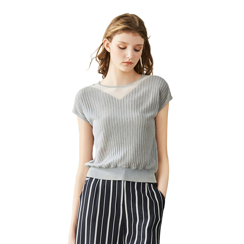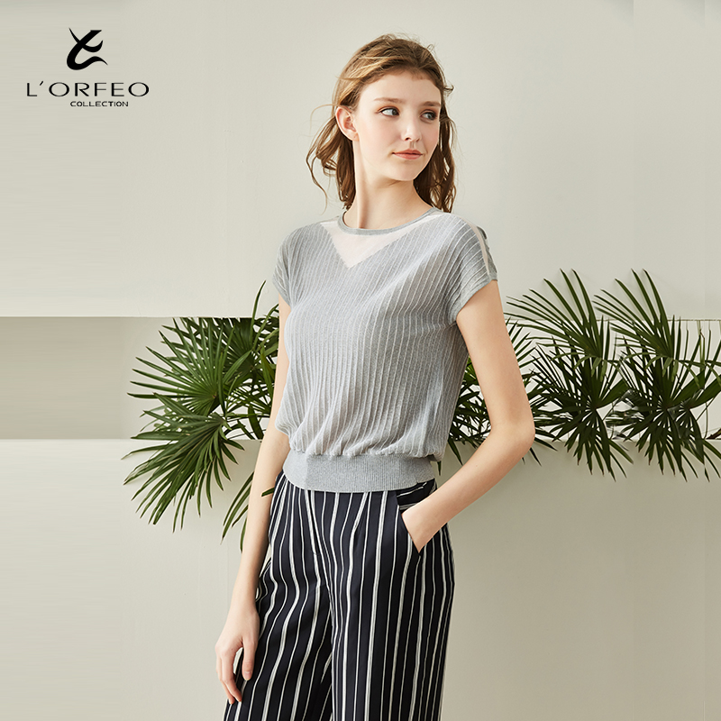 L'ORFEO/奥菲欧圆领短袖竖条纹针织衫百搭休闲内搭短款夏季上衣女