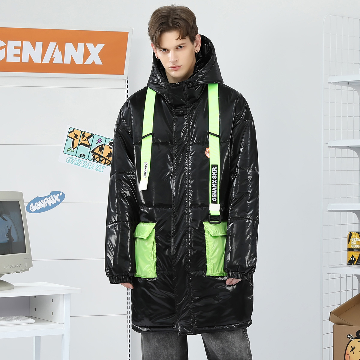 GENANX闪电潮牌冬季新款中长款荧光绿贴袋保暖防水连帽棉衣外套男
