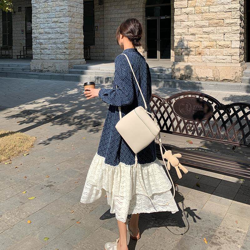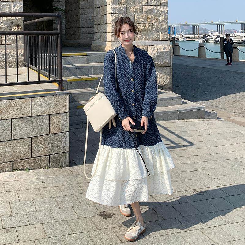 蕾丝拼接提花牛仔长袖连衣裙女春秋季2025新款气质复古高级感长裙