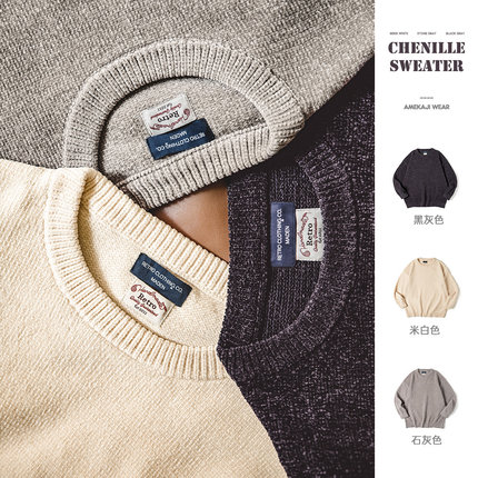 马登工装美式复古雪尼尔圆领毛衣保暖慵懒内搭打底针织衫男秋冬季
