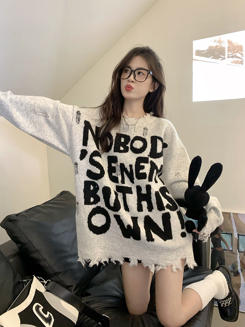 软糯韩系慵懒风毛衣女秋冬小众设计感破洞复古宽松中长款针织上衣