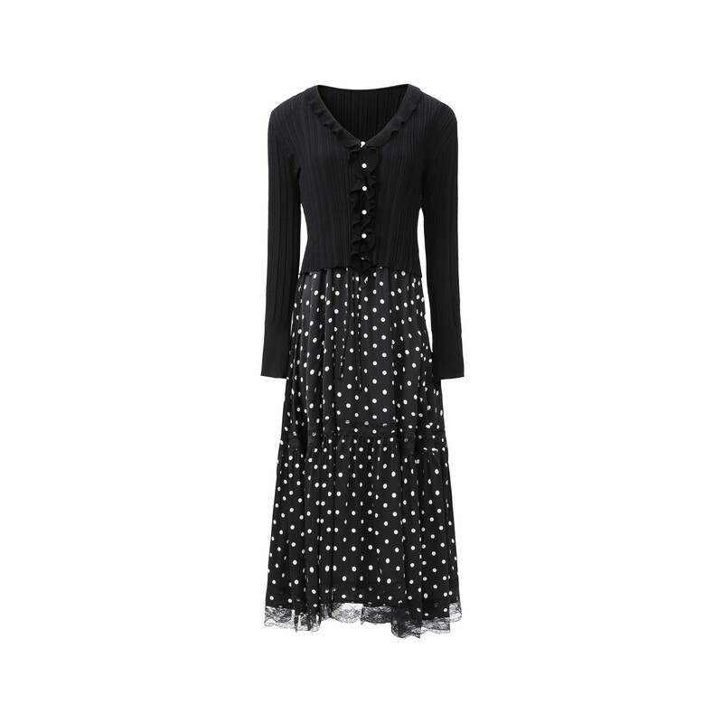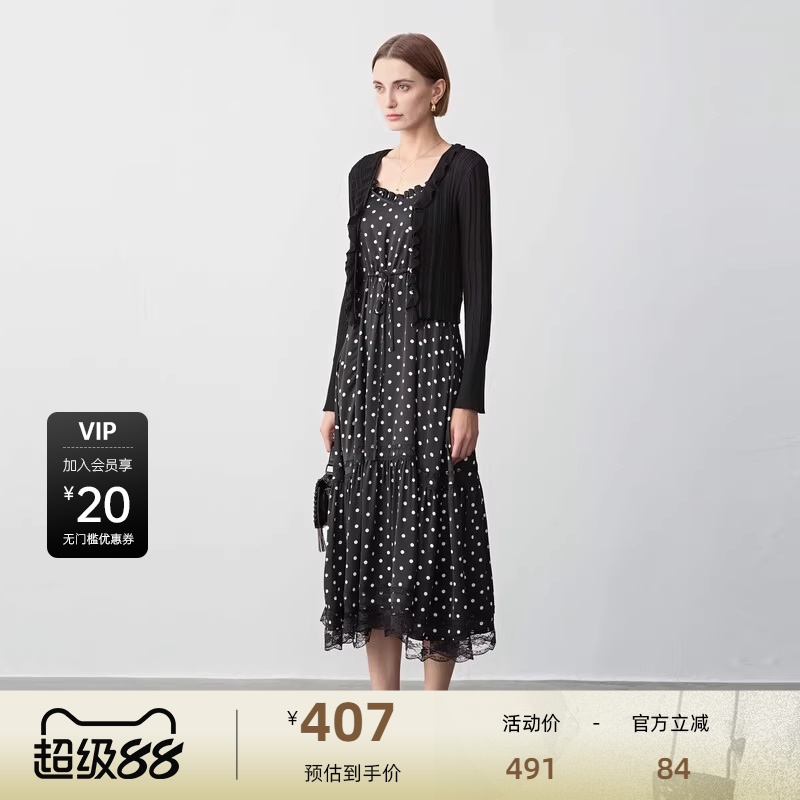 sdeer圣迪奥女装法式木耳边波点针织吊带裙套装S243Z1424
