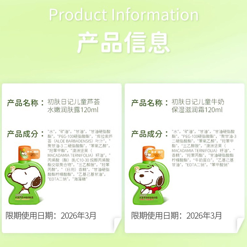 史努比儿童牛奶保湿滋润露芦荟水嫩润肤露补水乳液宝宝面霜身体乳