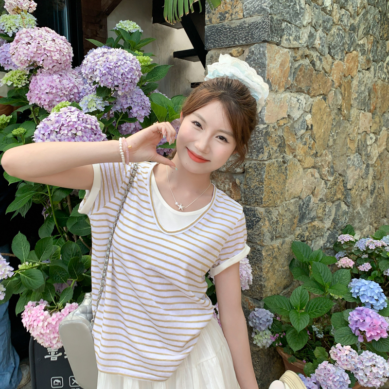 假两件条纹V领短袖T恤女装2025夏季新薄款竹节棉独特超好看小上衣