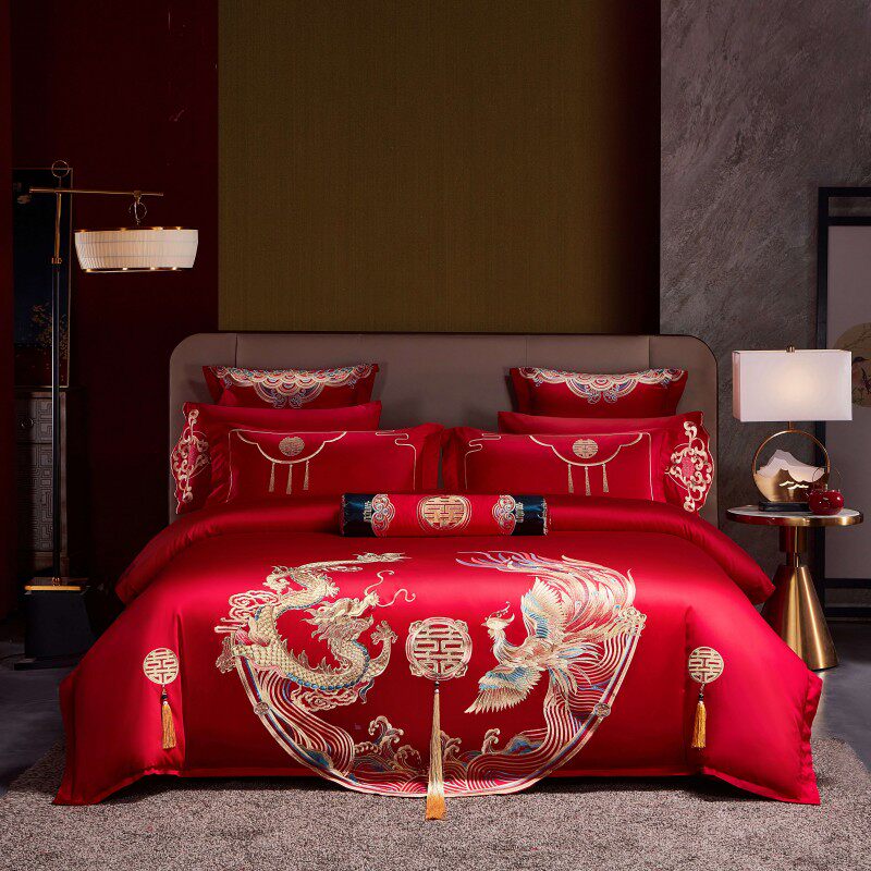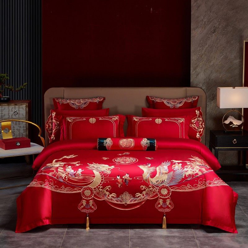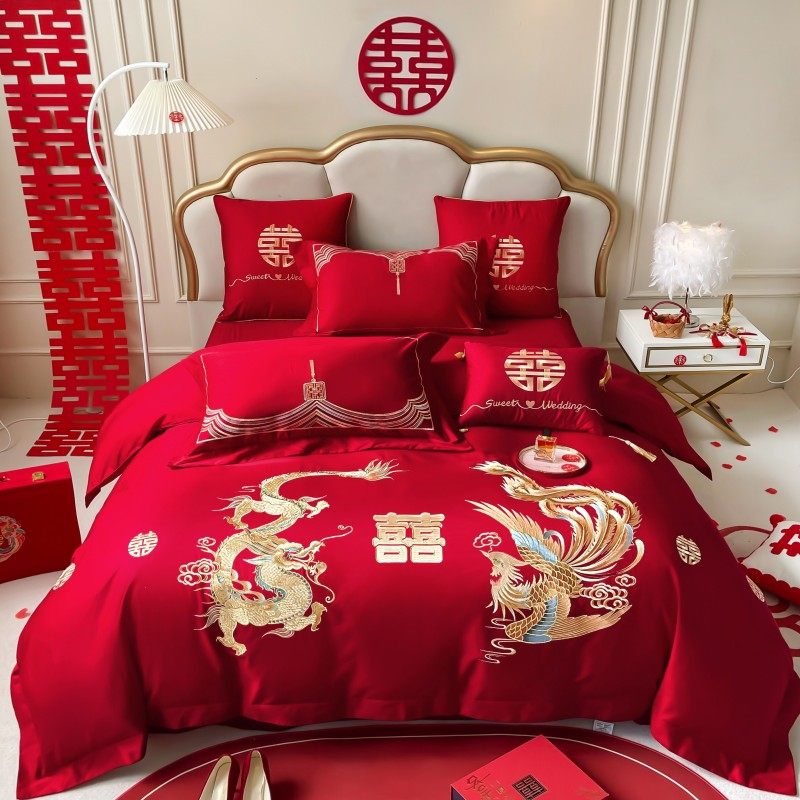 中式龙凤刺绣结婚四件套大红色床单被套喜被婚庆床上用品