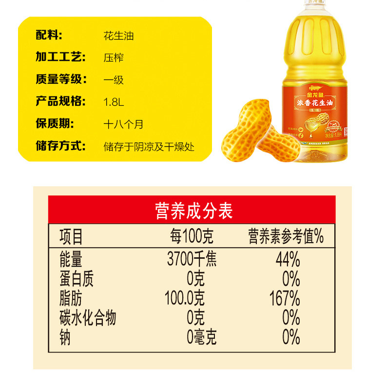 金龙鱼浓香花生油物理压榨一级家用炒菜小瓶食用油 1.8L-J