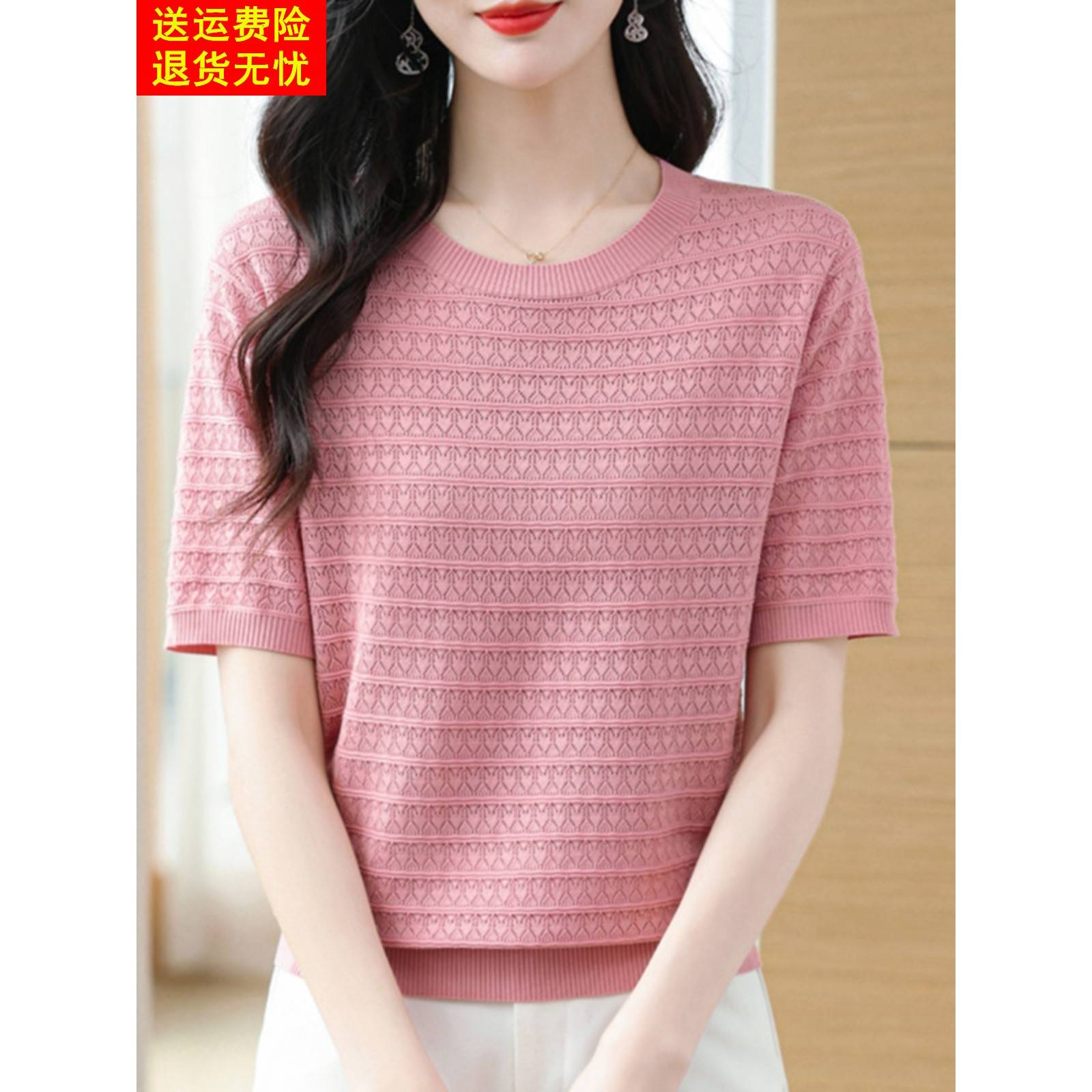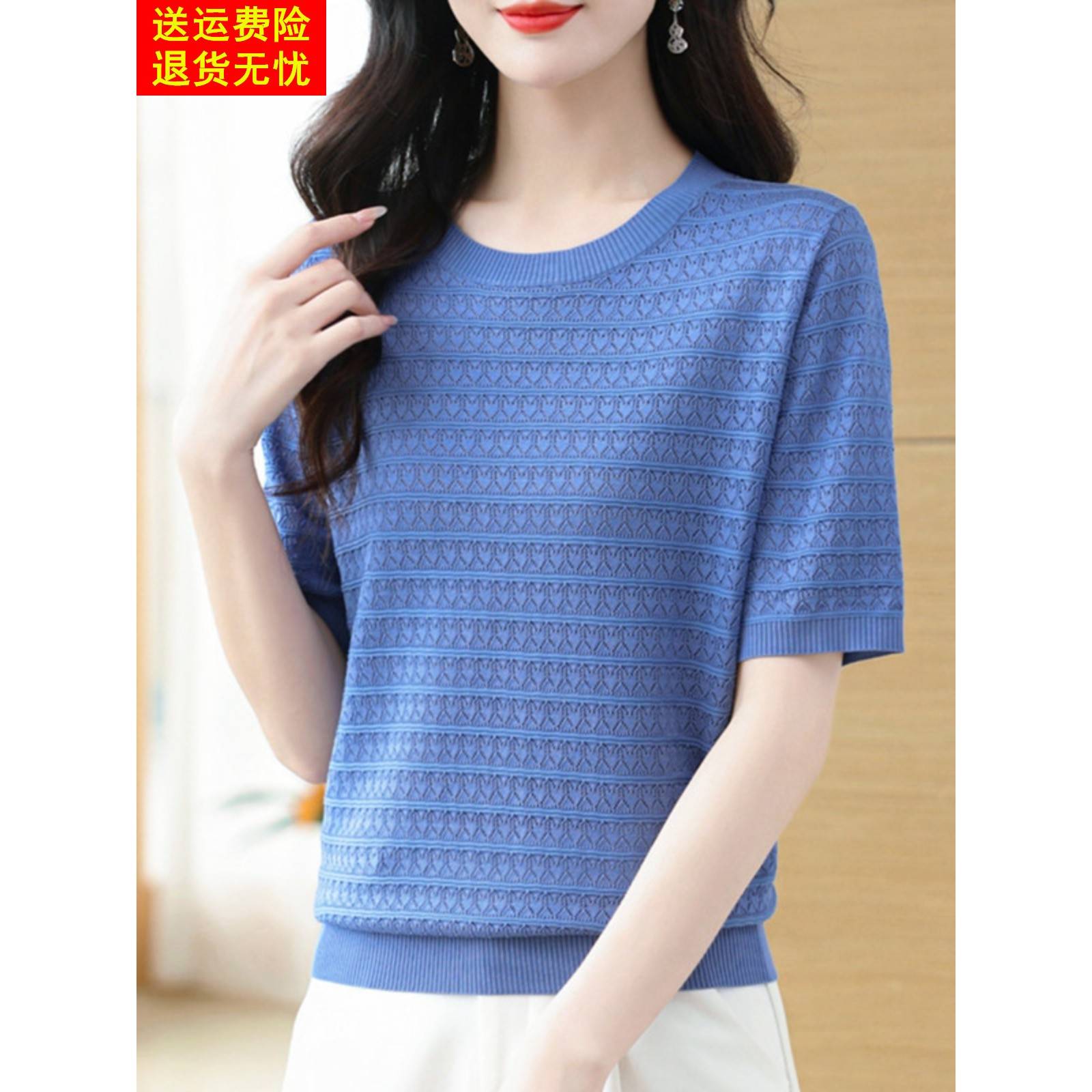 2025新款桑蚕丝短袖t恤女夏季妈妈洋气大码圆领宽松遮肚针织上衣