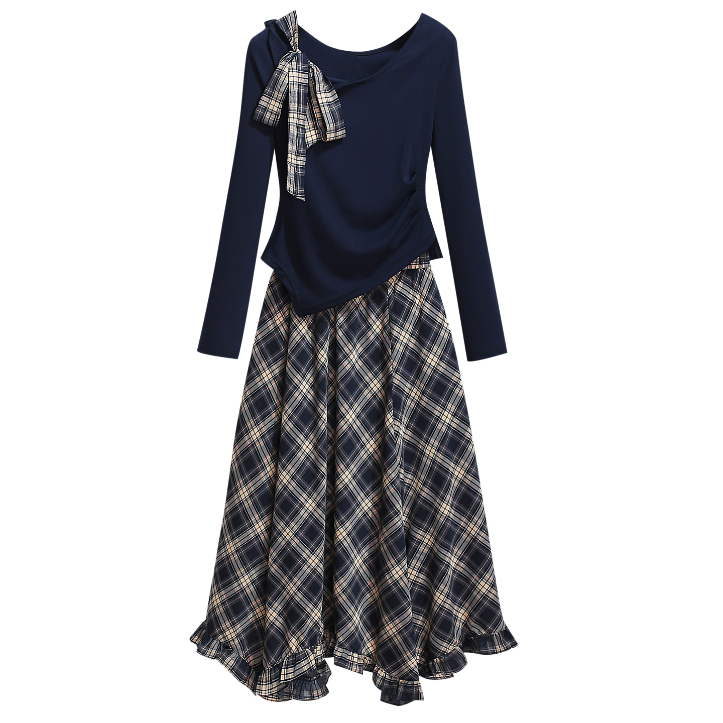 斜肩长袖T恤雪纺格子半身裙薄款女套装2025秋季新款藏蓝色连衣裙