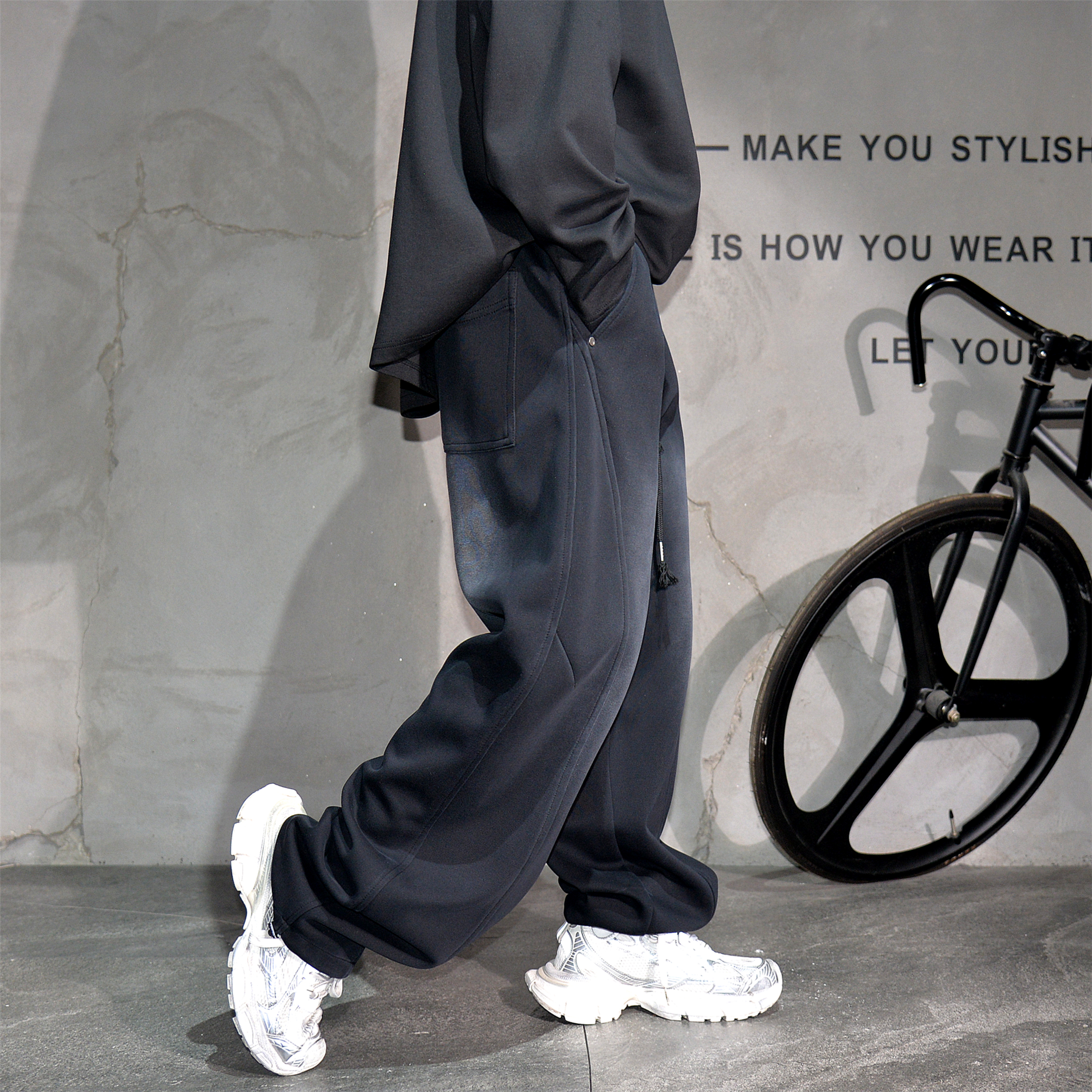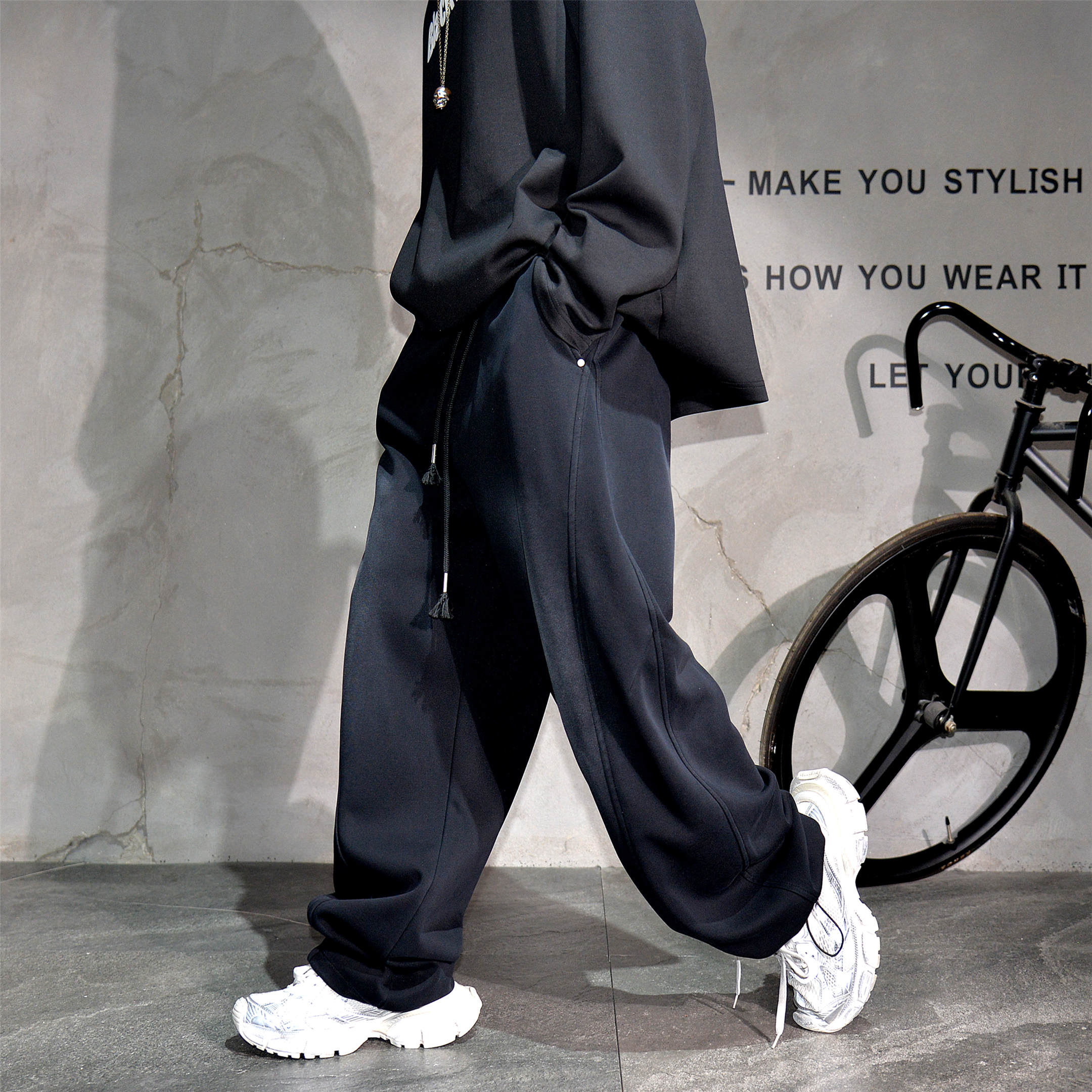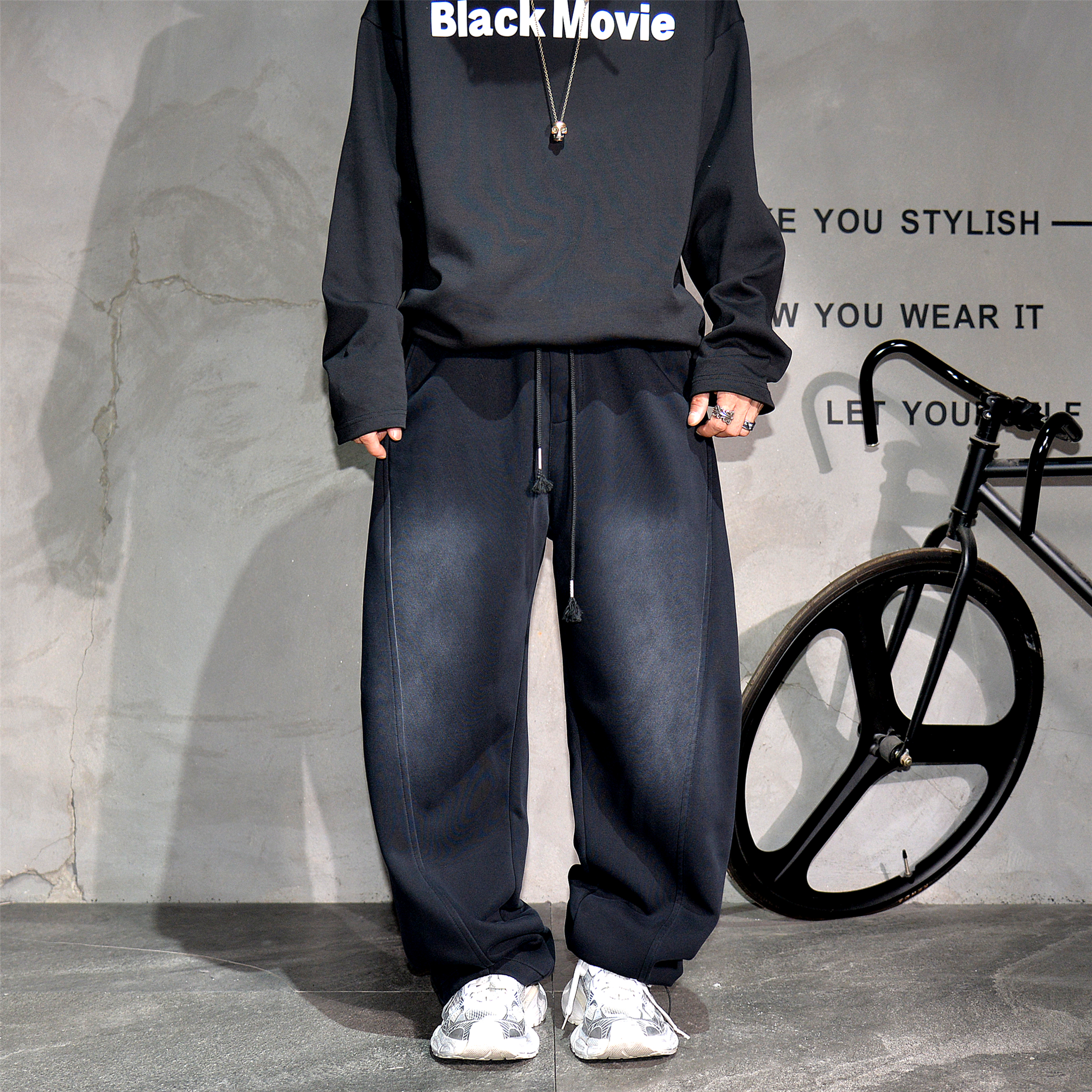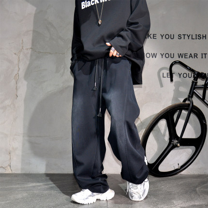 复古黑色做旧阔腿弯刀运动卫裤男潮牌痞帅休闲裤宽松可束脚直筒裤