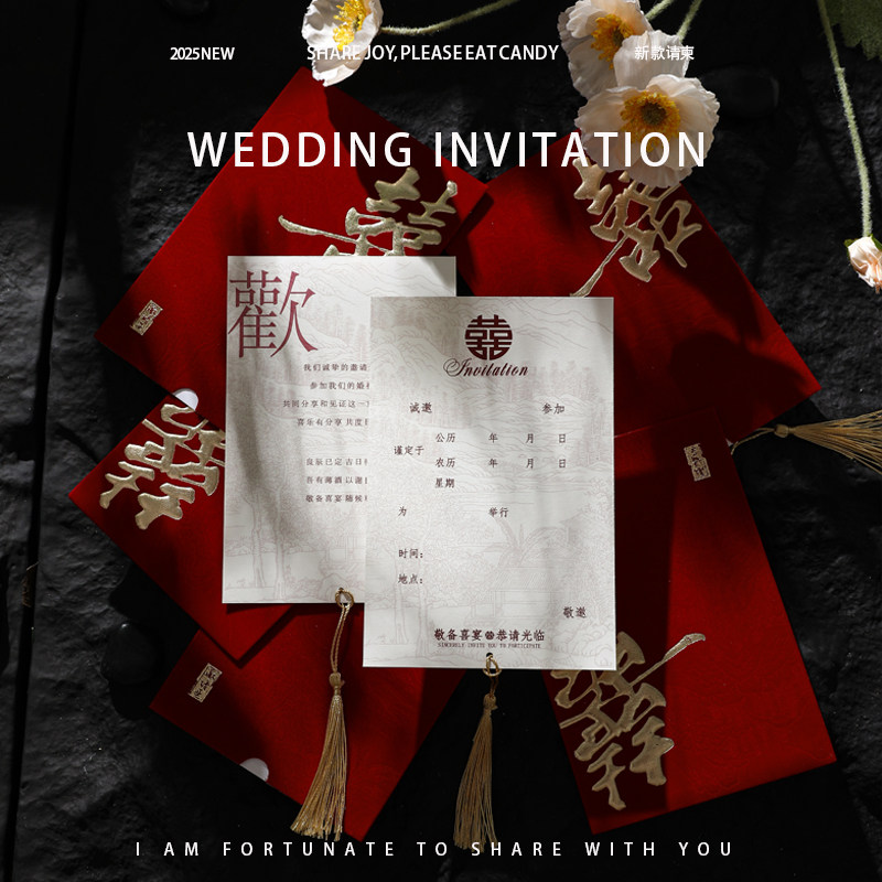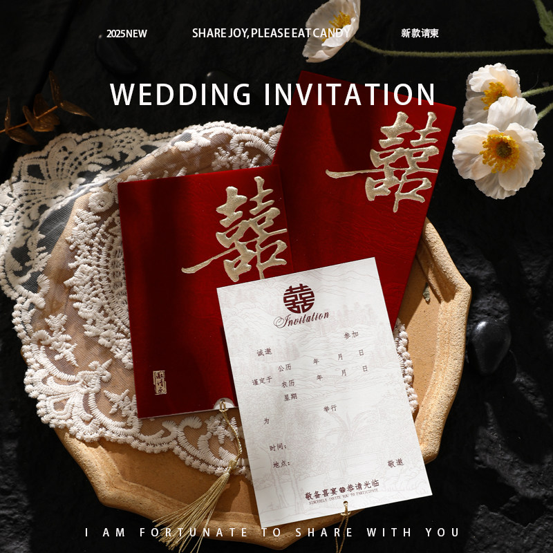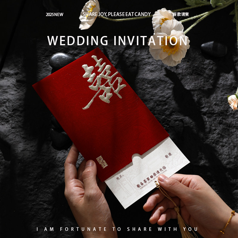 高端结婚请帖中式喜帖丝绒布酒红流苏结婚请柬高级感中国风邀请函