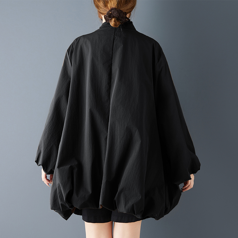秋季新款宽松港风小众设计感花苞形外套纯色V领长袖蓬蓬风衣外贸