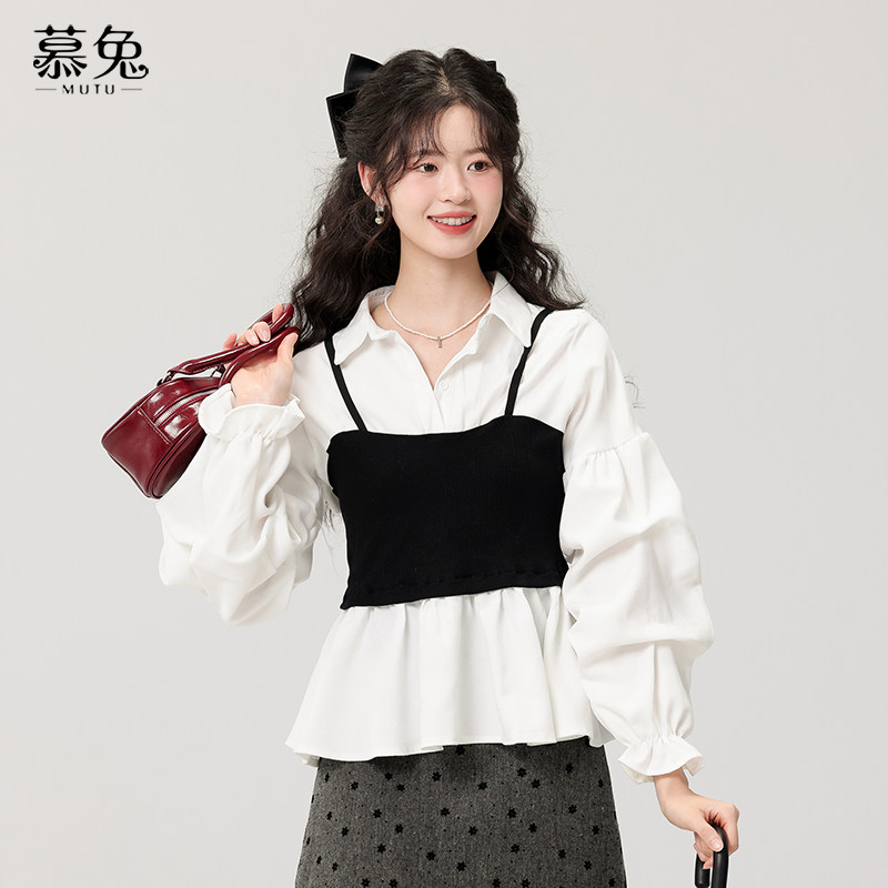 慕兔法式气质假两件白衬衫女2025秋季新款设计感小众收腰长袖上衣