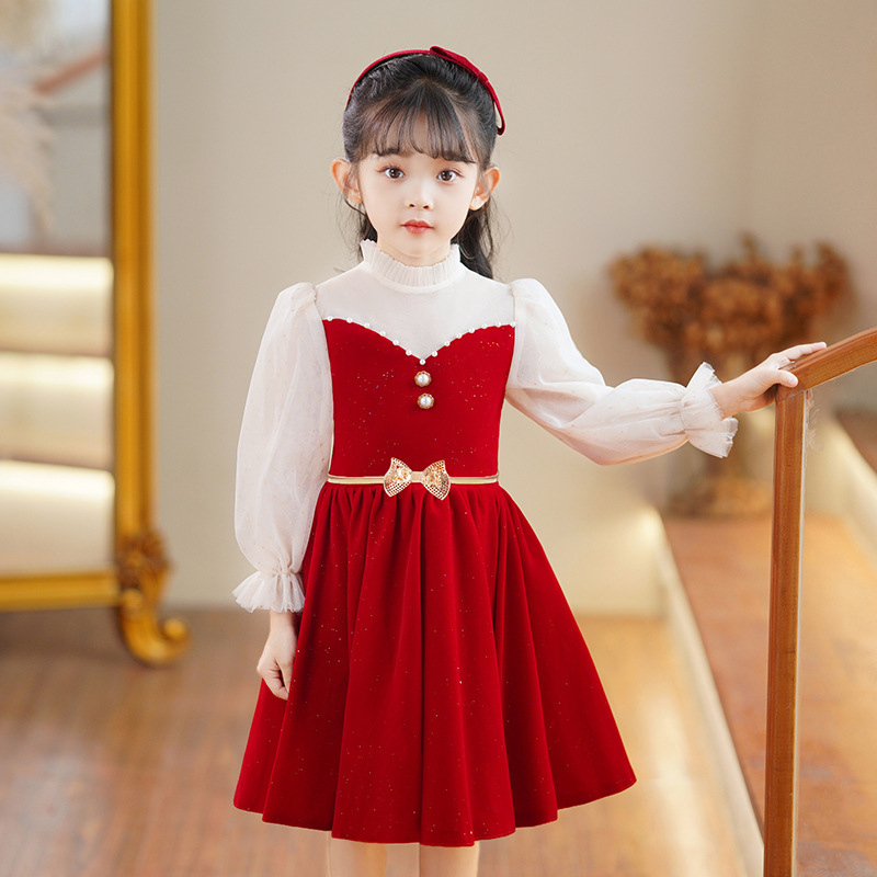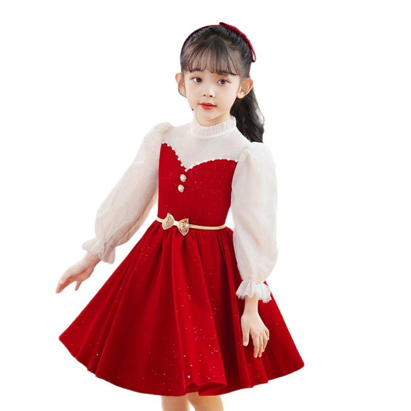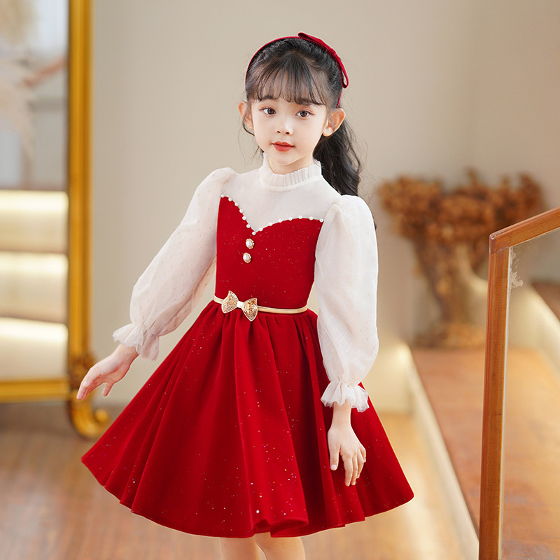儿童晚礼服女童红色生日高端公主裙女孩主持人钢琴演奏演出服秋冬