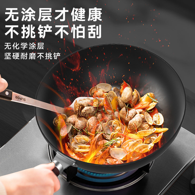 苏泊尔铁锅炒菜锅家用燃气灶圆底老式无涂层炒锅煤气灶专用精铁锅