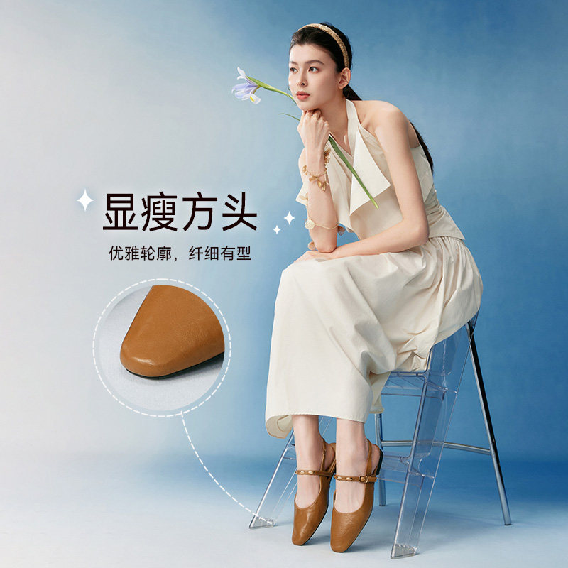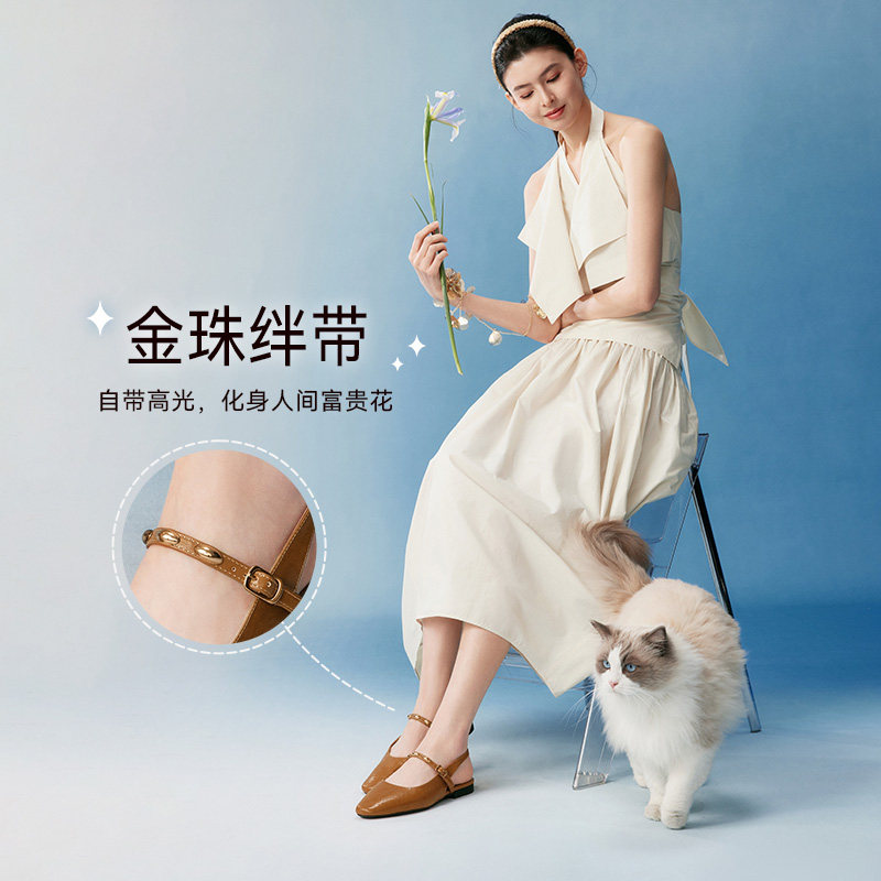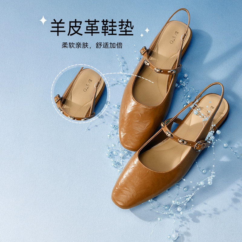 百思图2025夏季新款时尚简约通勤粗跟圆头后空女凉鞋F1101BH5