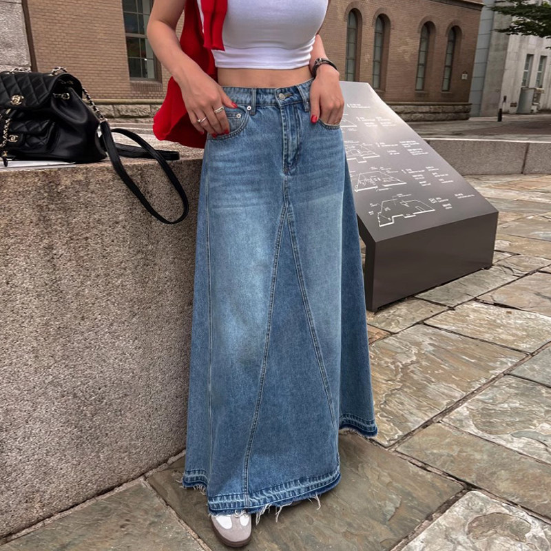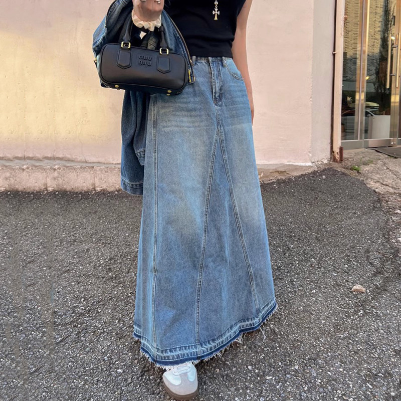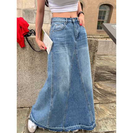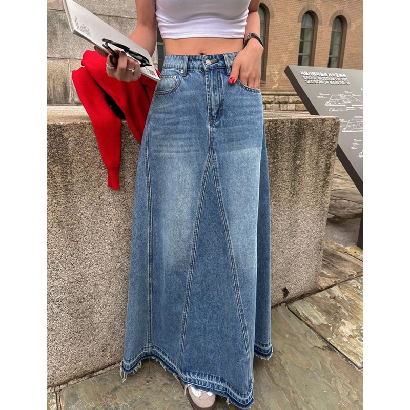 韩国chic秋冬复古小众高腰百搭拼接毛边A字水洗牛仔半身裙长裙女
