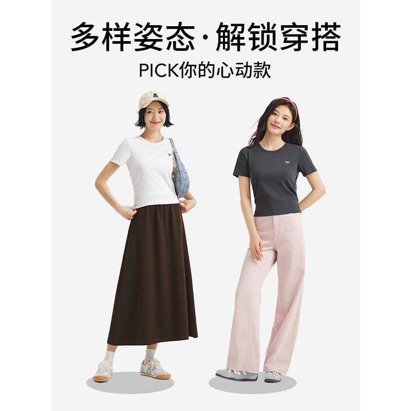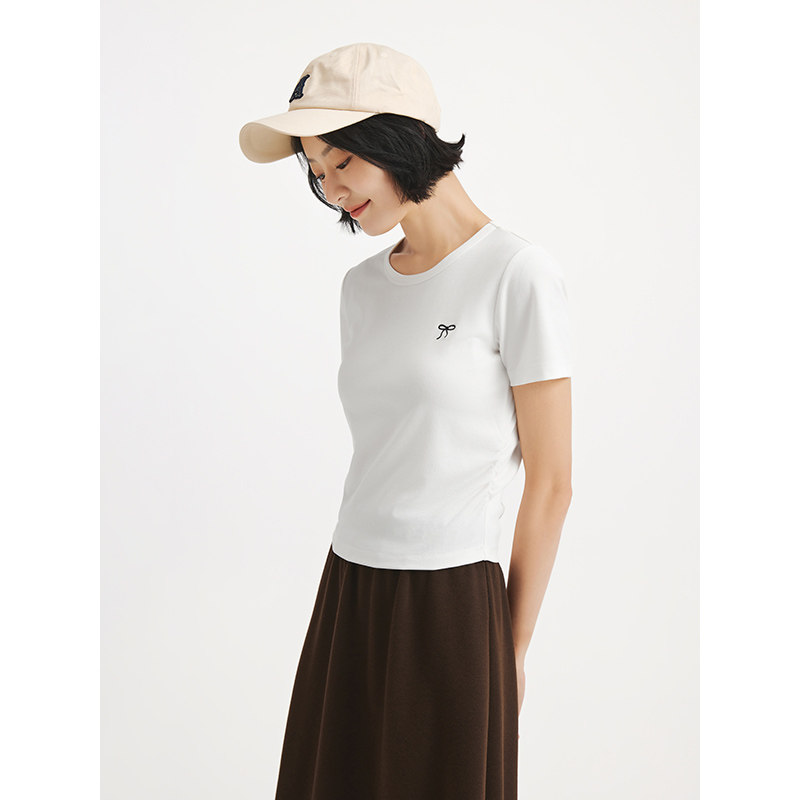 热风女士短袖T恤上衣2025年秋季新款修身蝴蝶结短T恤白色打底衫