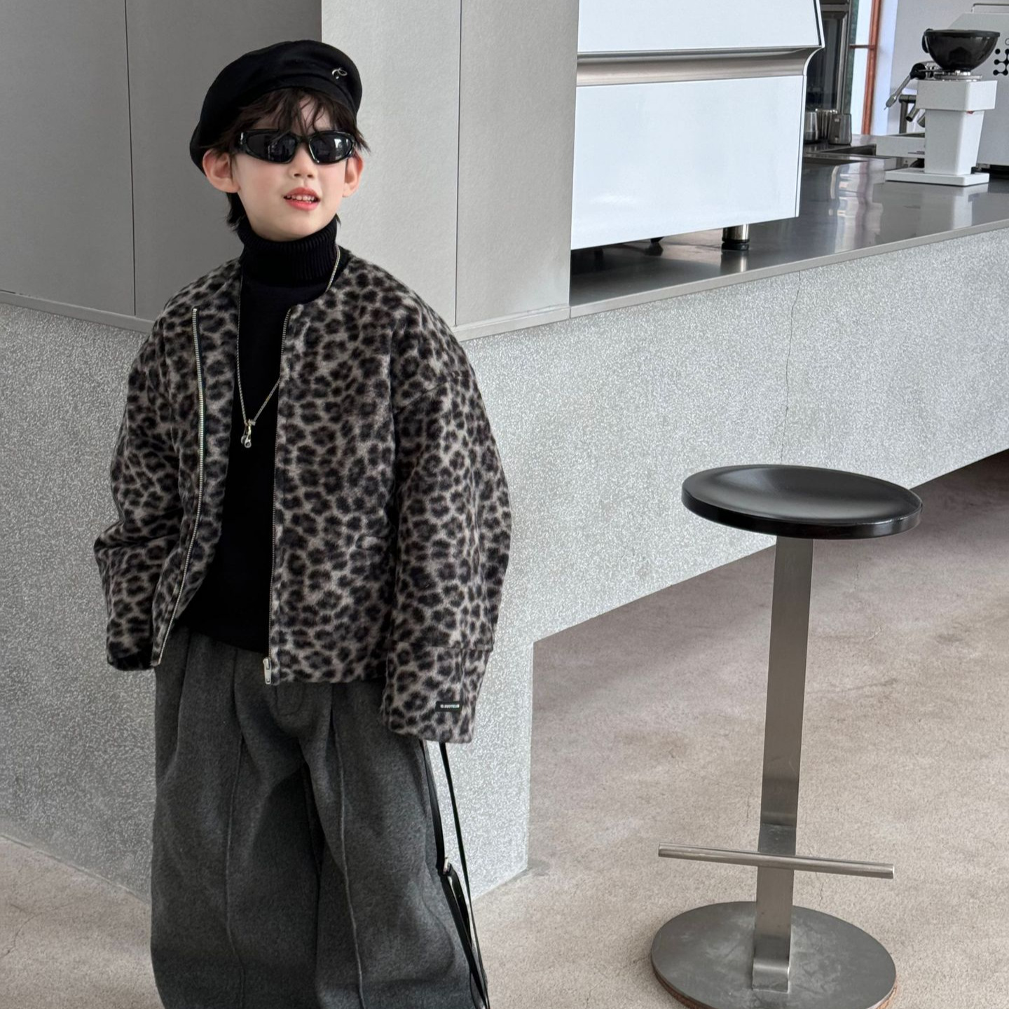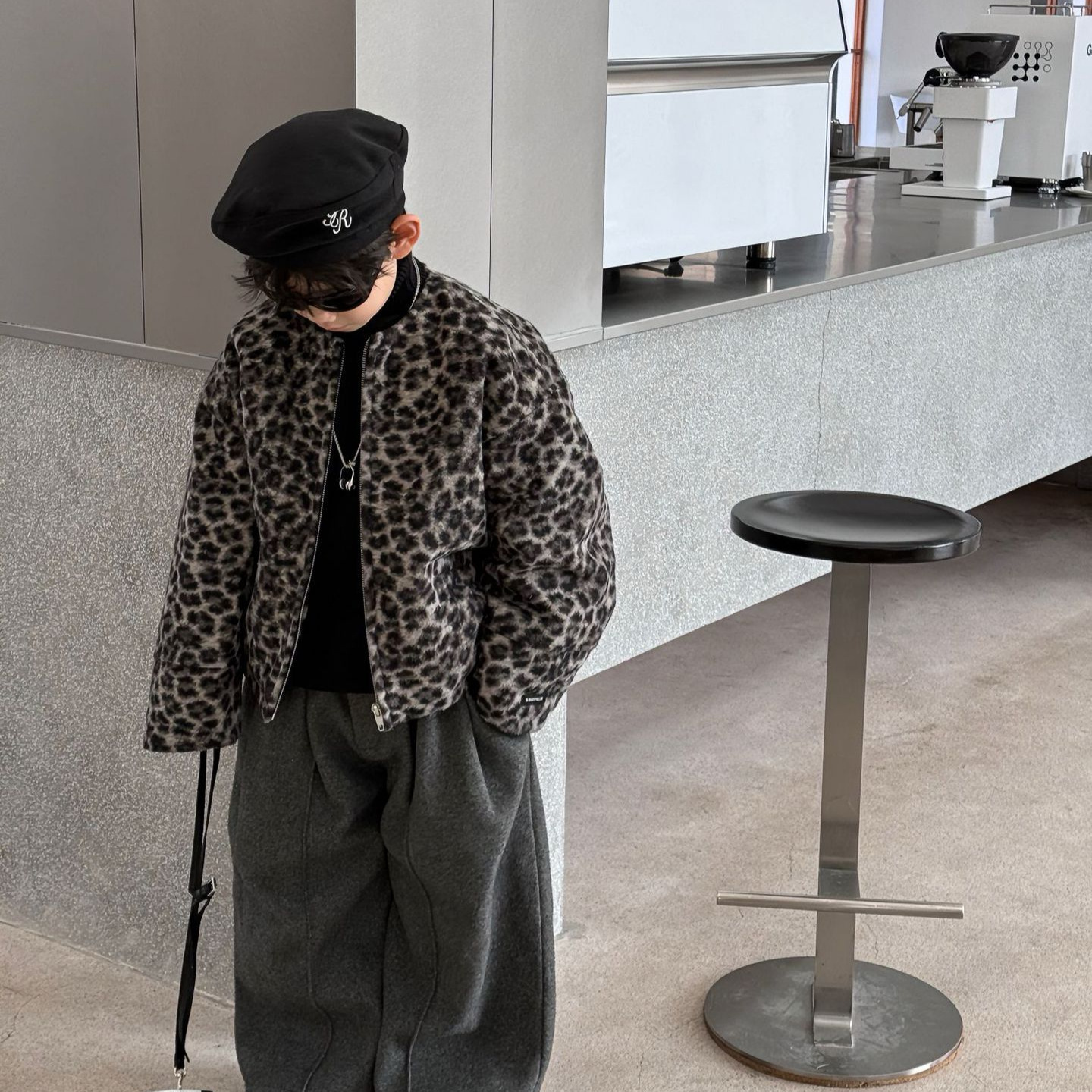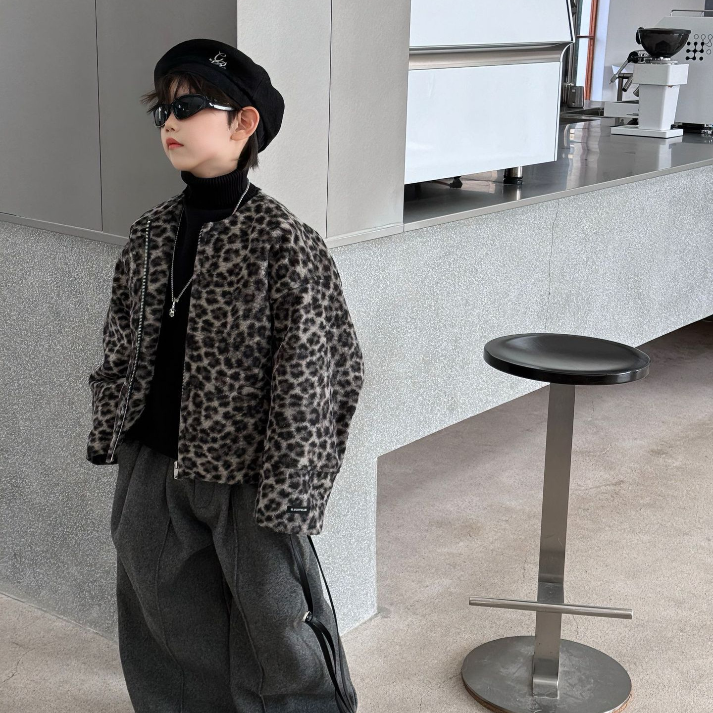 男童呢子外套夹棉保暖冬季2025新款儿童加厚棉服洋气豹纹夹克上衣