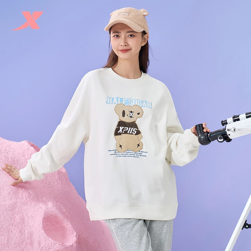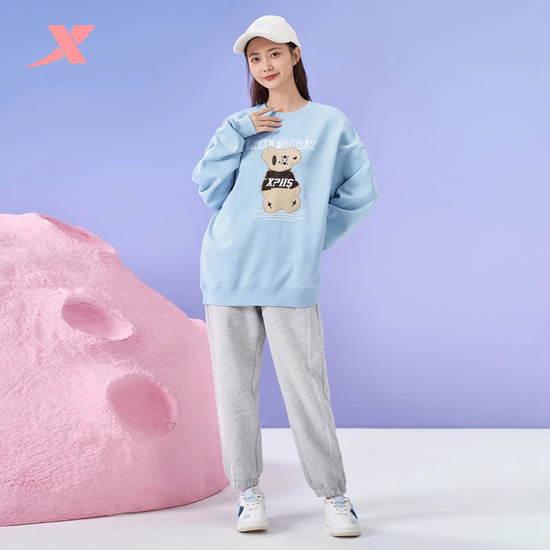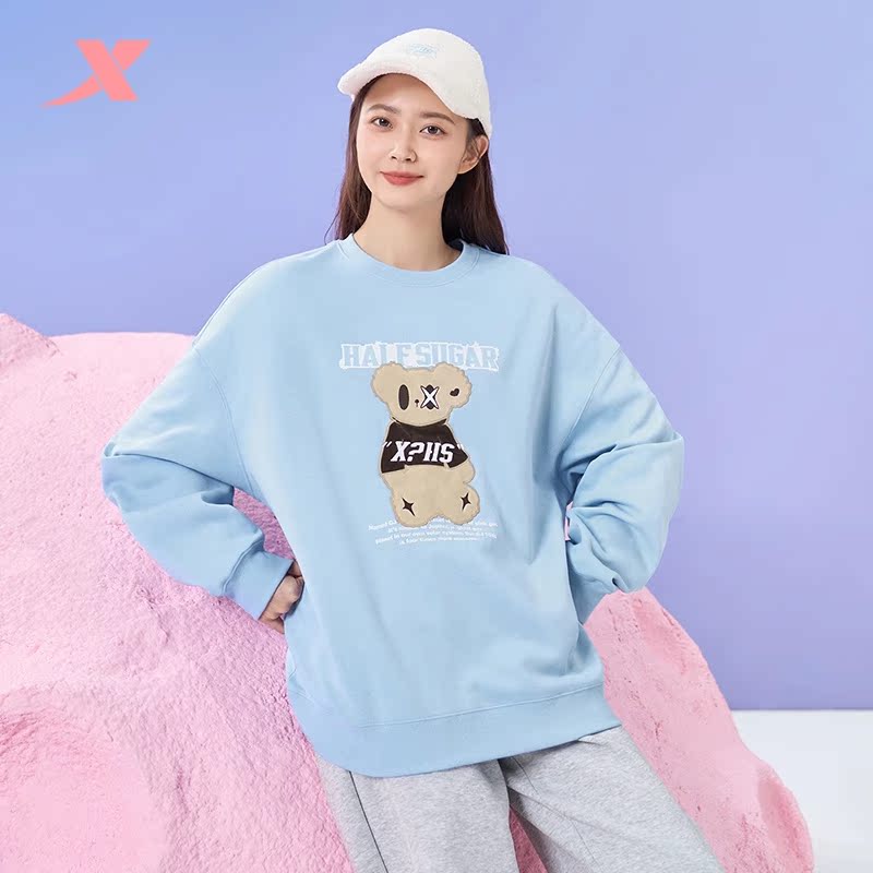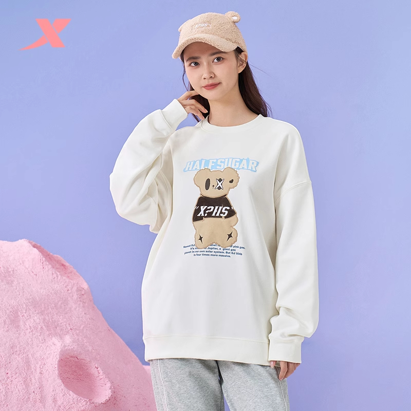 特步半糖加绒卫衣女冬季新款圆领小熊印花套头衫977428920480
